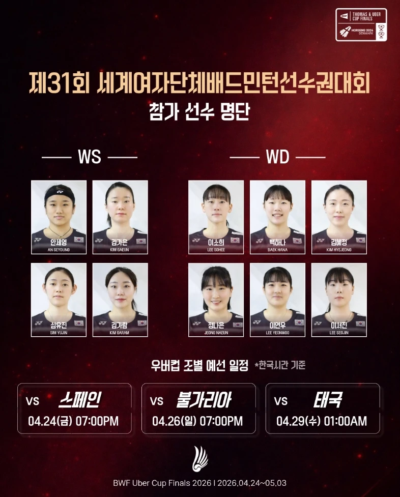 한국은 이번 우버컵에서 대회 통산 세 번째 우승에 도전한다. 지난 2022 우버컵에서 안세영을 앞세워 2010년 대회 이후 12년 만이자 역대 두 번째 우버컵 우승에 성공했다. 당시 안세영은 결승에서 중국을 꺾으면서 첫 우버컵 우승을 맛봤다.