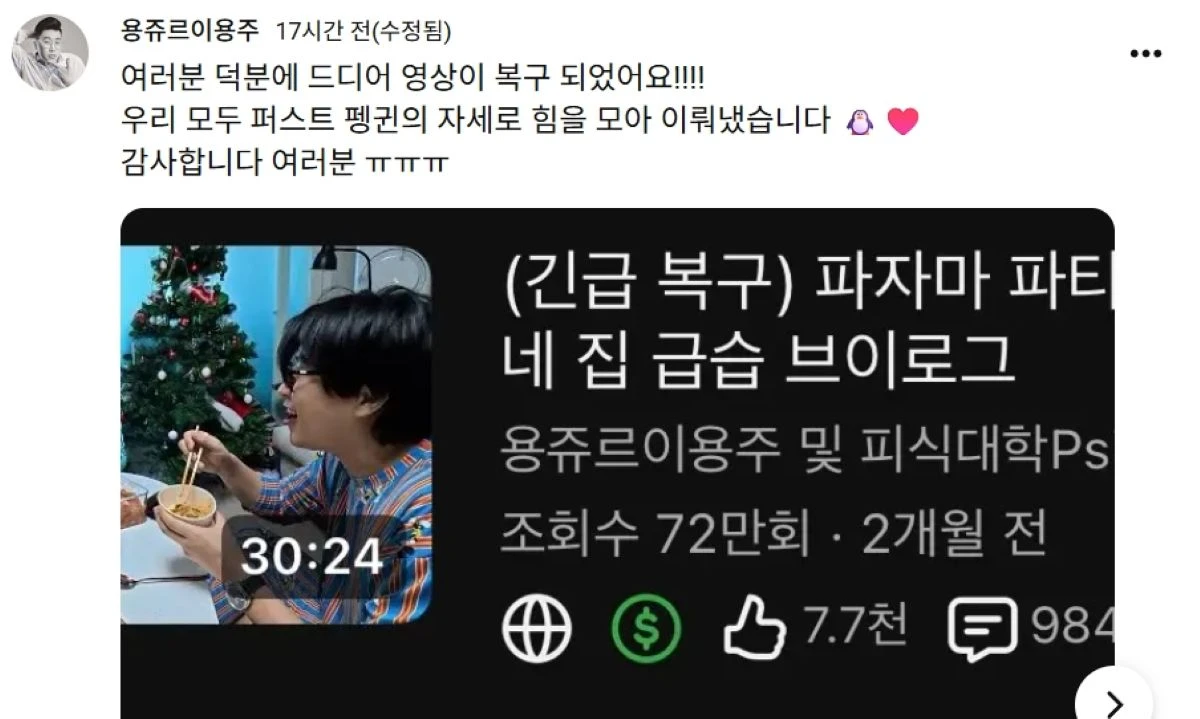 14일 이용주는 유튜브 커뮤니티를 통해 "여러분 덕분에 드디어 영상이 복구됐다"며 채널 정상화 소식을 알렸다.