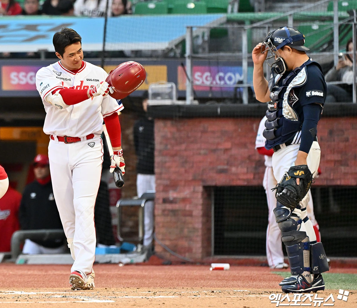 (엑스포츠뉴스 인천, 김한준 기자) 14일 오후 인천SSG랜더스필드에서 열린 '2026 신한 SOL Bank KBO리그' 두산 베어스와 SSG 랜더스의 경기,1회말 무사 1루 SSG 김재환이 두산 양의지에게 인사를 하고 있다.