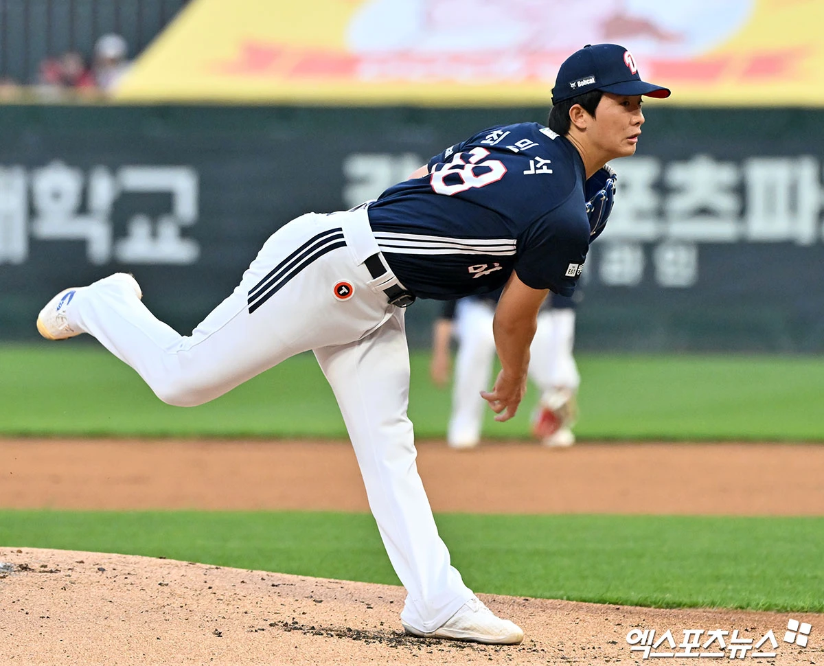 (엑스포츠뉴스 인천, 김한준 기자) 14일 오후 인천SSG랜더스필드에서 열린 '2026 신한 SOL Bank KBO리그' 두산 베어스와 SSG 랜더스의 경기, 1회말 두산 선발투수 최민석이 공을 힘차게 던지고 있다.