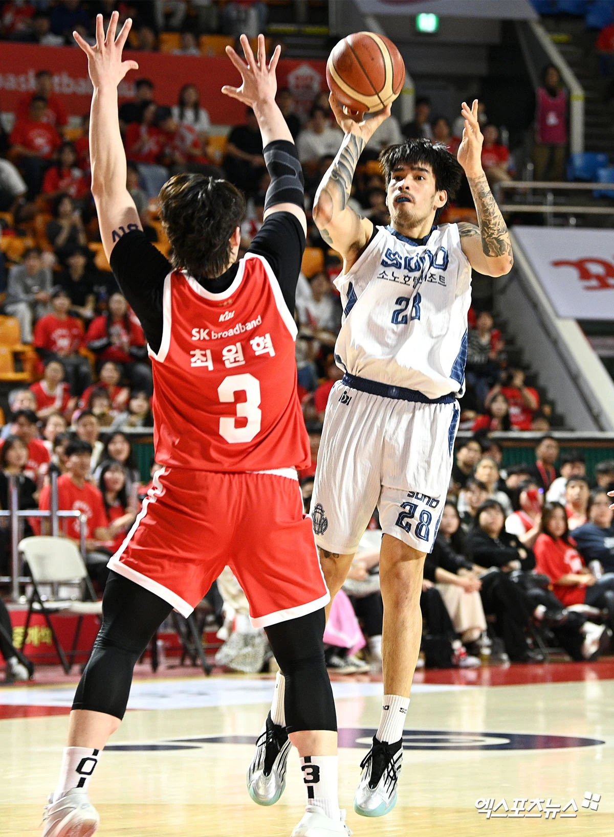 (엑스포츠뉴스 잠실학생체, 고아라 기자) 14일 오후 서울 송파구 잠실학생체육관에서 열린 2025-2026 LG전자 프로농구 서울 SK와 고양 소노의 6강 플레이오프 2차전, 소노 켐바오가 슛을 시도하고 있다.
