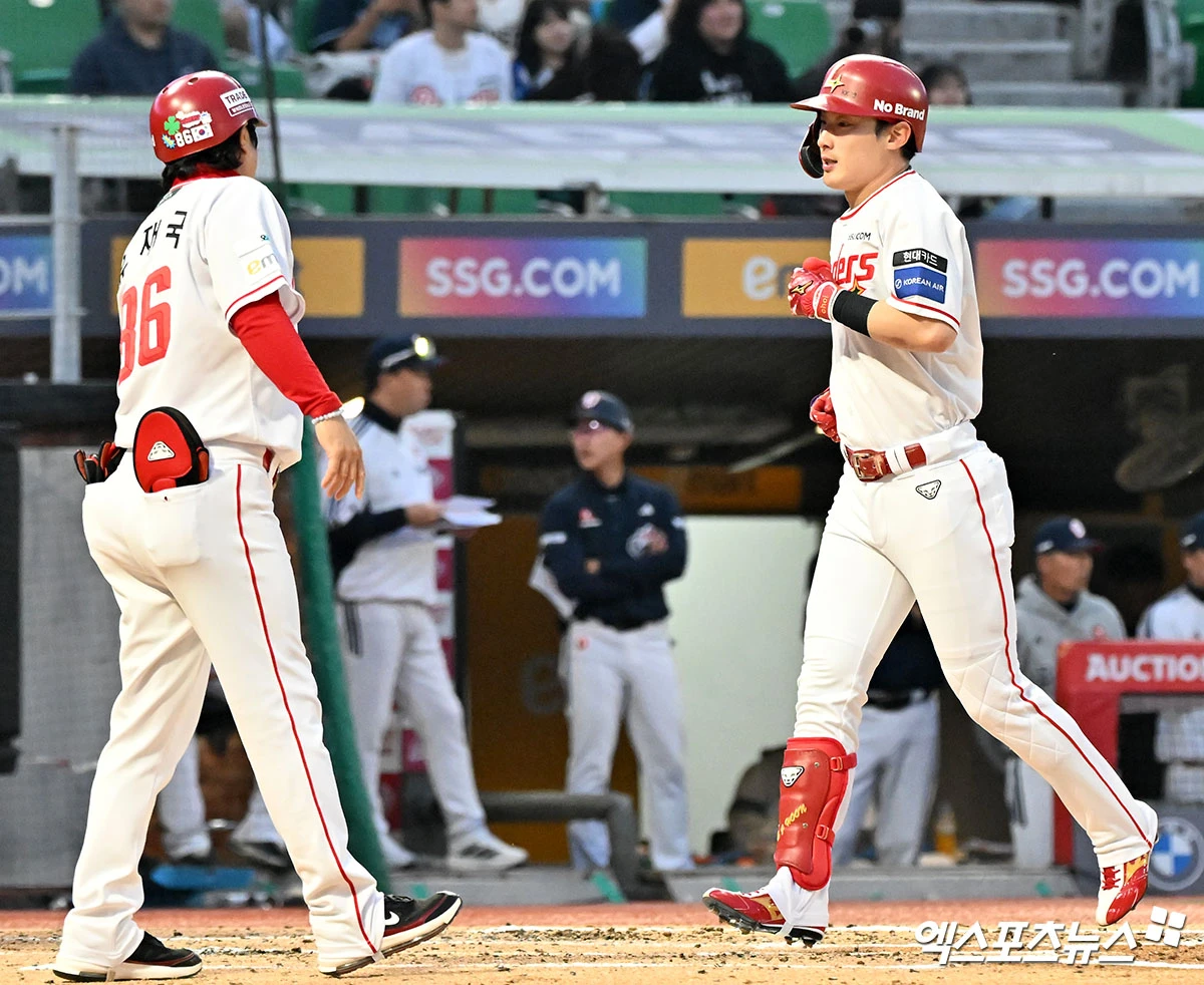 (엑스포츠뉴스 인천, 김한준 기자) 14일 오후 인천SSG랜더스필드에서 열린 '2026 신한 SOL Bank KBO리그' 두산 베어스와 SSG 랜더스의 경기, 2회말 1사 1루 SSG 최지훈이 투런 홈런을 날린 후 기뻐하고 있다.