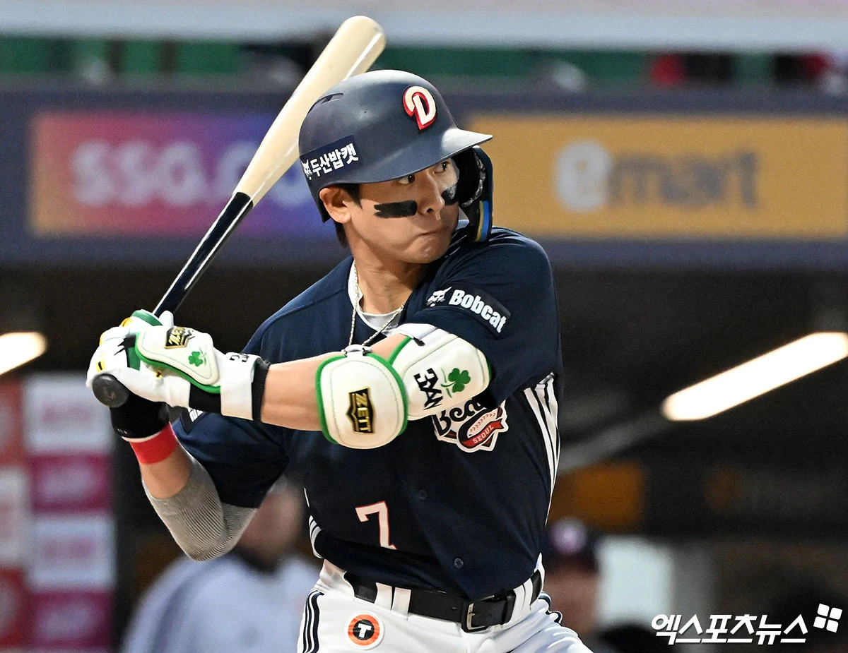 (엑스포츠뉴스 인천, 김한준 기자) 14일 오후 인천SSG랜더스필드에서 열린 '2026 신한 SOL Bank KBO리그' 두산 베어스와 SSG 랜더스의 경기, 3회초 두산 박찬호가 솔로 홈런을 날리고 있다.