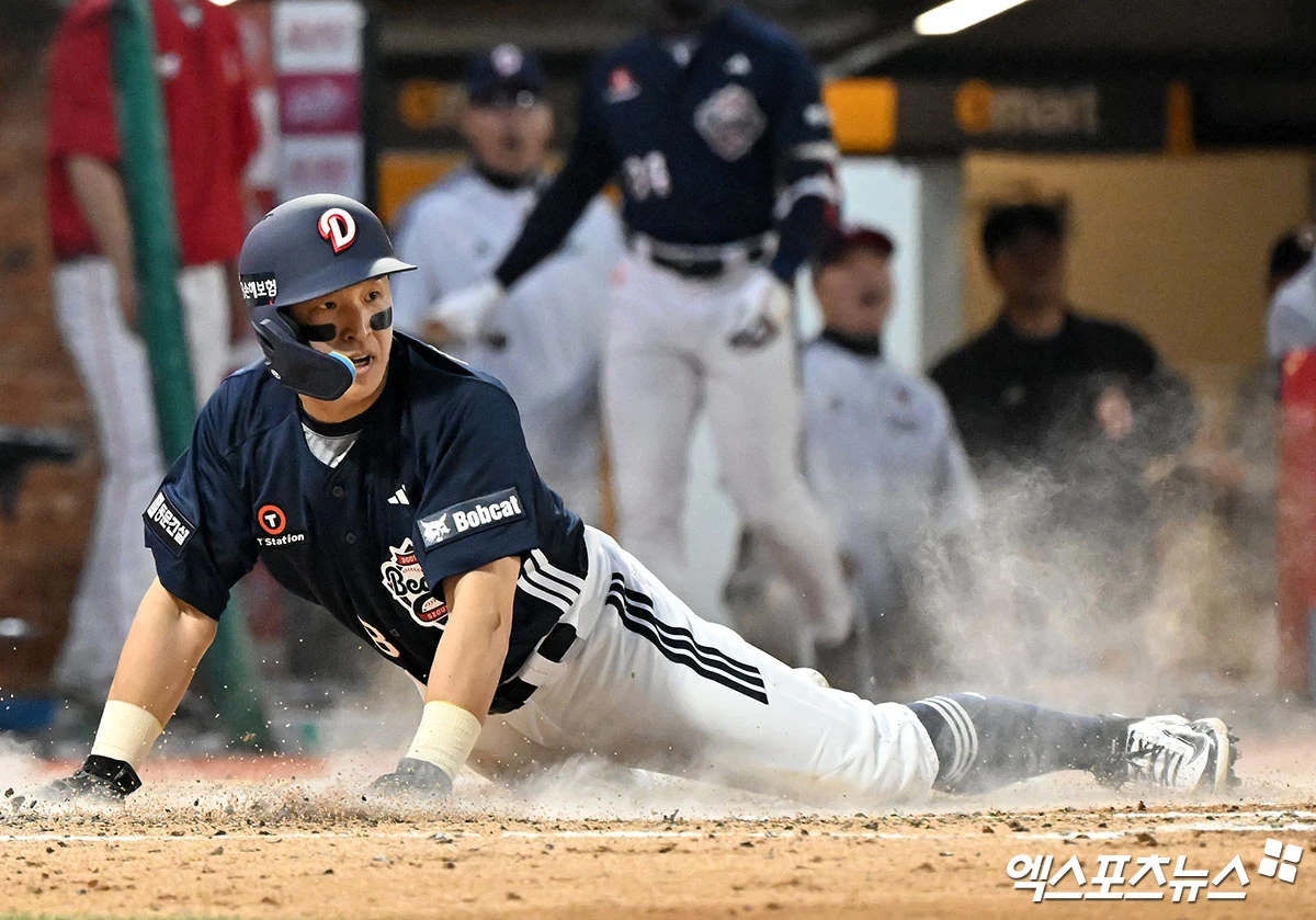 (엑스포츠뉴스 인천, 김한준 기자) 14일 오후 인천SSG랜더스필드에서 열린 '2026 신한 SOL Bank KBO리그' 두산 베어스와 SSG 랜더스의 경기, 3회초 무사 2루 두산 손아섭이 박준순의 1타점 적시타때 홈으로 쇄도하고 있다.