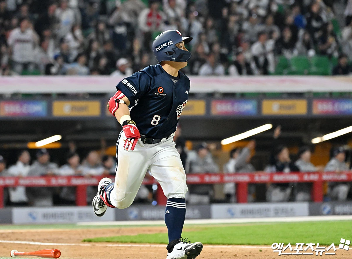 (엑스포츠뉴스 인천, 김한준 기자) 14일 오후 인천SSG랜더스필드에서 열린 '2026 신한 SOL Bank KBO리그' 두산 베어스와 SSG 랜더스의 경기, 4회초 1사 2루 두산 손아섭이 투런 홈런을 날리고 있다.