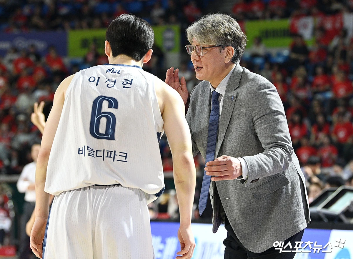 (엑스포츠뉴스 잠실학생체, 고아라 기자) 14일 오후 서울 송파구 잠실학생체육관에서 열린 2025-2026 LG전자 프로농구 서울 SK와 고양 소노의 6강 플레이오프 2차전, 소노 손창환 감독이 이정현에게 작전 지시를 하고 있다.