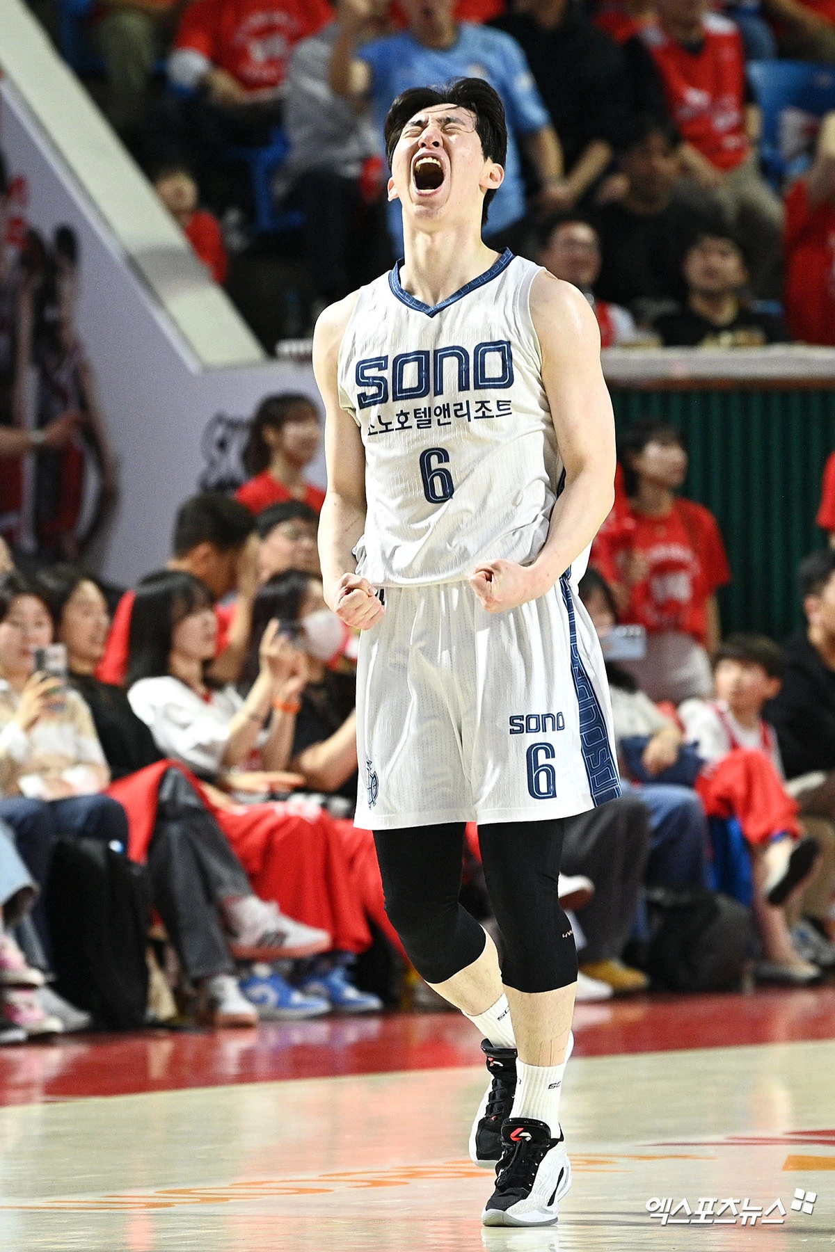 (엑스포츠뉴스 잠실학생체, 고아라 기자) 14일 오후 서울 송파구 잠실학생체육관에서 열린 2025-2026 LG전자 프로농구 서울 SK와 고양 소노의 6강 플레이오프 2차전, 소노 이정현이 득점한 뒤 세리머니를 하고 있다.