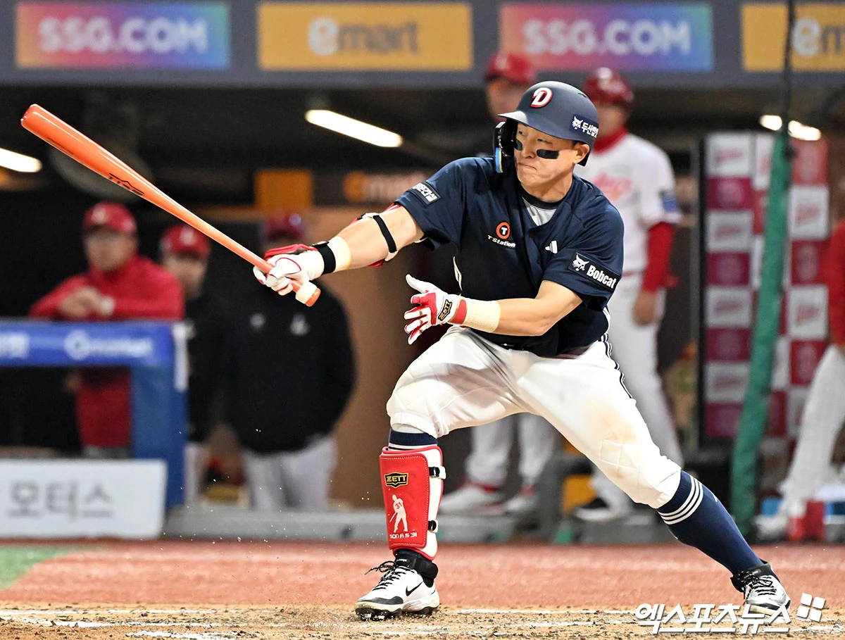 (엑스포츠뉴스 인천, 김한준 기자) 14일 오후 인천SSG랜더스필드에서 열린 '2026 신한 SOL Bank KBO리그' 두산 베어스와 SSG 랜더스의 경기, 8회초 1사 두산 손아섭이 타격을 하고 있다. 결과는 2루수 땅볼 아웃.