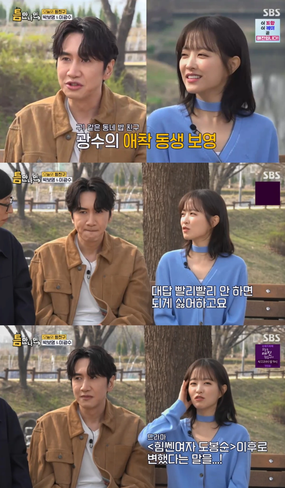14일 방송된 SBS 예능 프로그램 '틈만 나면, 시즌4' 마지막회에서는 '틈 친구'로 배우 이광수, 박보영이 출연했다.