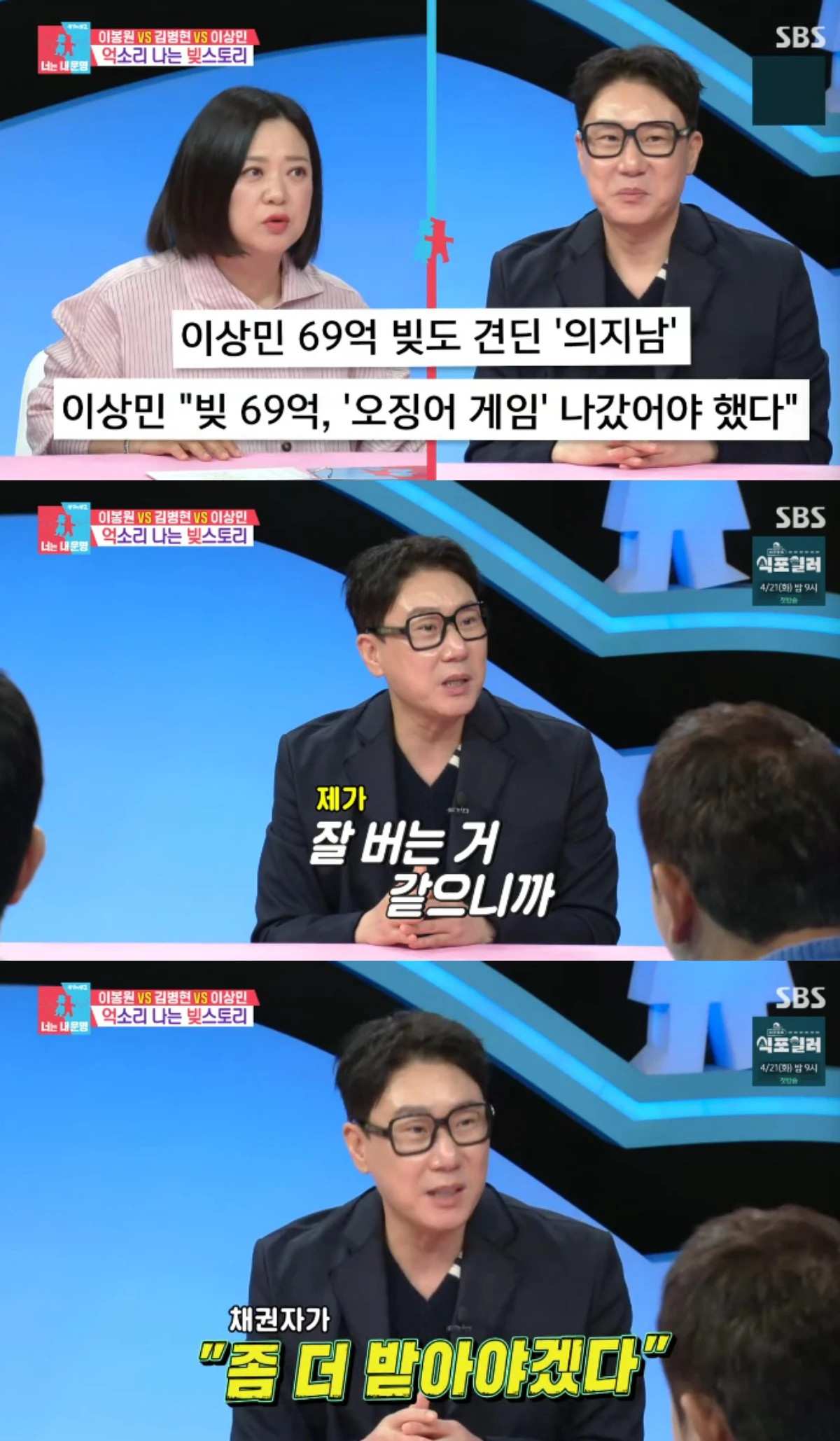 이상민은 "제가 방송이 잘되고 돈을 잘 버는 것 같으니까 채권자들이 돈을 더 받으려고 했다. 그런건 방송에서 말하지 않았다"고 말해 눈길을 끌었다.