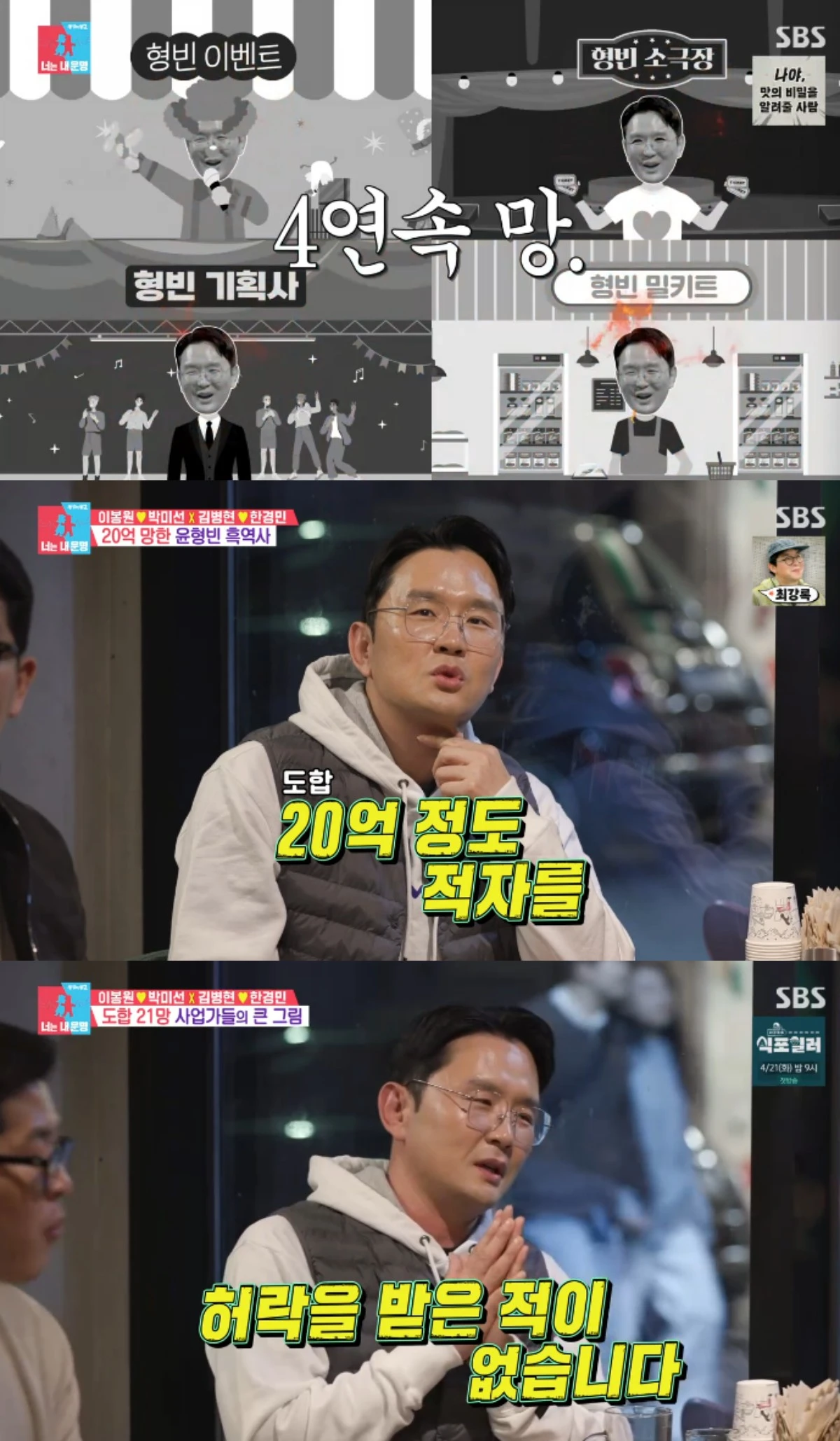 윤형빈은 사업 실패로 인한 손실액이 20억 정도 된다면서 데뷔 전에 했던 이벤트 회사, 데뷔 후에 했던 공영장 등이 망했음을 전했다.