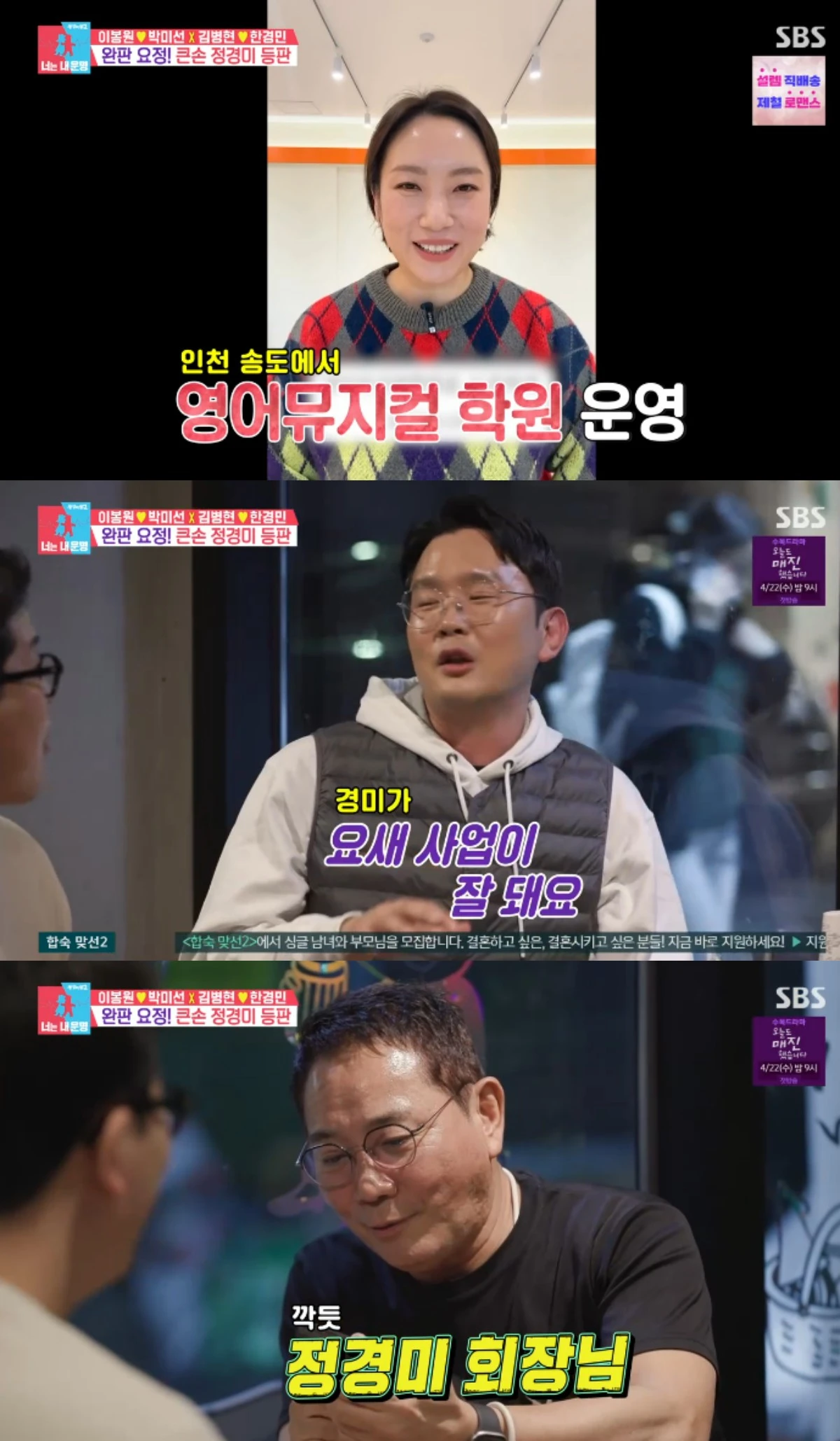 이에 대해 "경미가 송도 영어 뮤지컬 학원 오픈했는데, 요즘 사업이 괜찮다. 잘되고 있다. 그래서 '언젠가 한번은 손을 벌리겠다'는 생각을 했는데, 아내한테 기회를 줘도 될 것 같다"고 말해 웃음을 자아냈다.