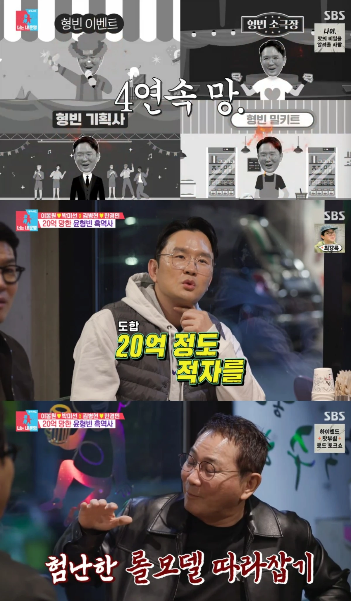 이를 들은 이봉원은 "나는 6번 망했다. 내가 롤모델이면 2번은 더 망해야한다"고 장난쳤고, 윤형빈은 "KFC 할아버지도 계속 망하다가 62세에 터진 것"이라고 받아쳤다.