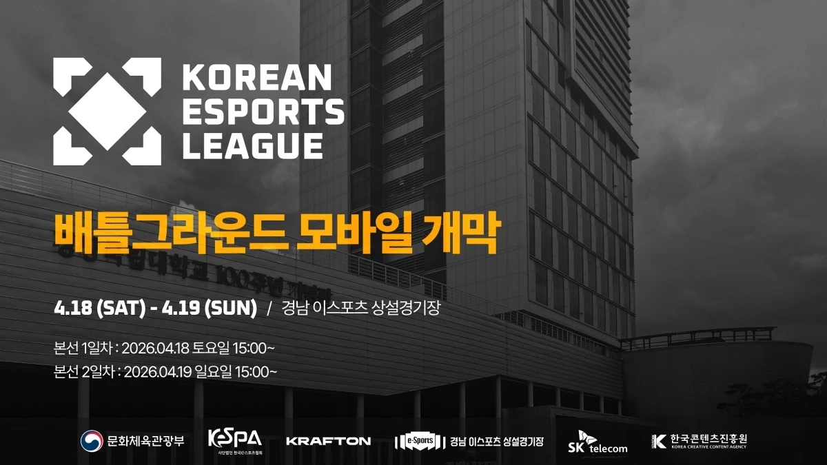 (엑스포츠뉴스 유희은 기자) 한국e스포츠협회(이하 협회)는 2026 대한민국 이스포츠 리그(2026 Korean Esports League, 이하 2026 KEL) 배틀그라운드 모바일 종목이 오는 18일(토) 경남 이스포츠 상설경기장(경남 진주)에서 개막한다고 밝혔다.