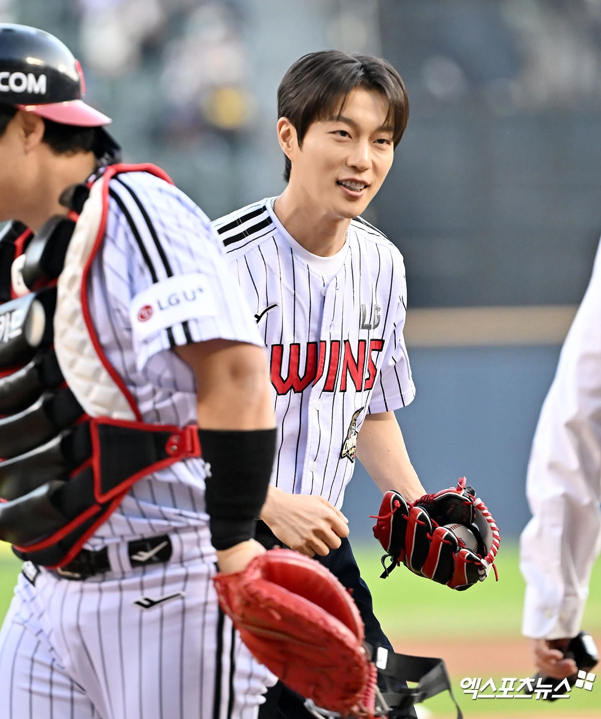 (엑스포츠뉴스 잠실, 김한준 기자) 15일 오후 서울 송파구 잠실야구장에서 열린 '2026 신한 SOL Bank KBO리그' 롯데 자이언츠와 LG 트윈스의 경기, 경기 전 하이라이트 윤두준이 시구에 임하고 있다.