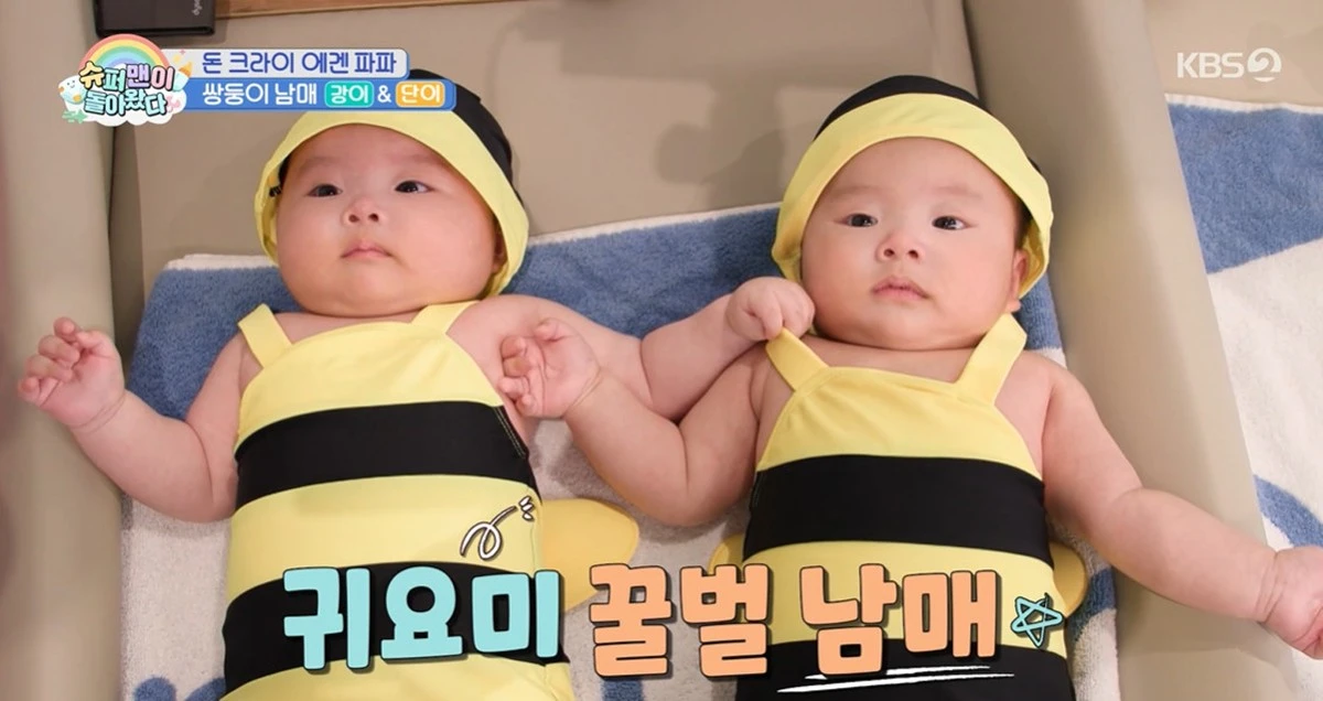 수영을 위해 꿀벌 옷으로 갈아입은 쌍둥이의 모습에 스튜디오는 "너무 닮았다", "귀엽다"며 감탄사를 내뱉었다.