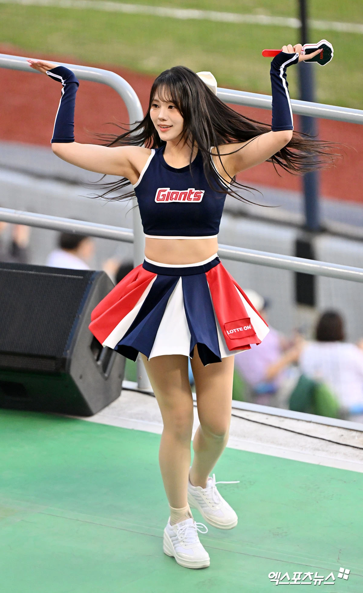 (엑스포츠뉴스 잠실, 김한준 기자) 15일 오후 서울 송파구 잠실야구장에서 열린 '2026 신한 SOL Bank KBO리그' 롯데 자이언츠와 LG 트윈스의 경기, 롯데오효정 치어리더가 열띤 응원을 선보이고 있다.