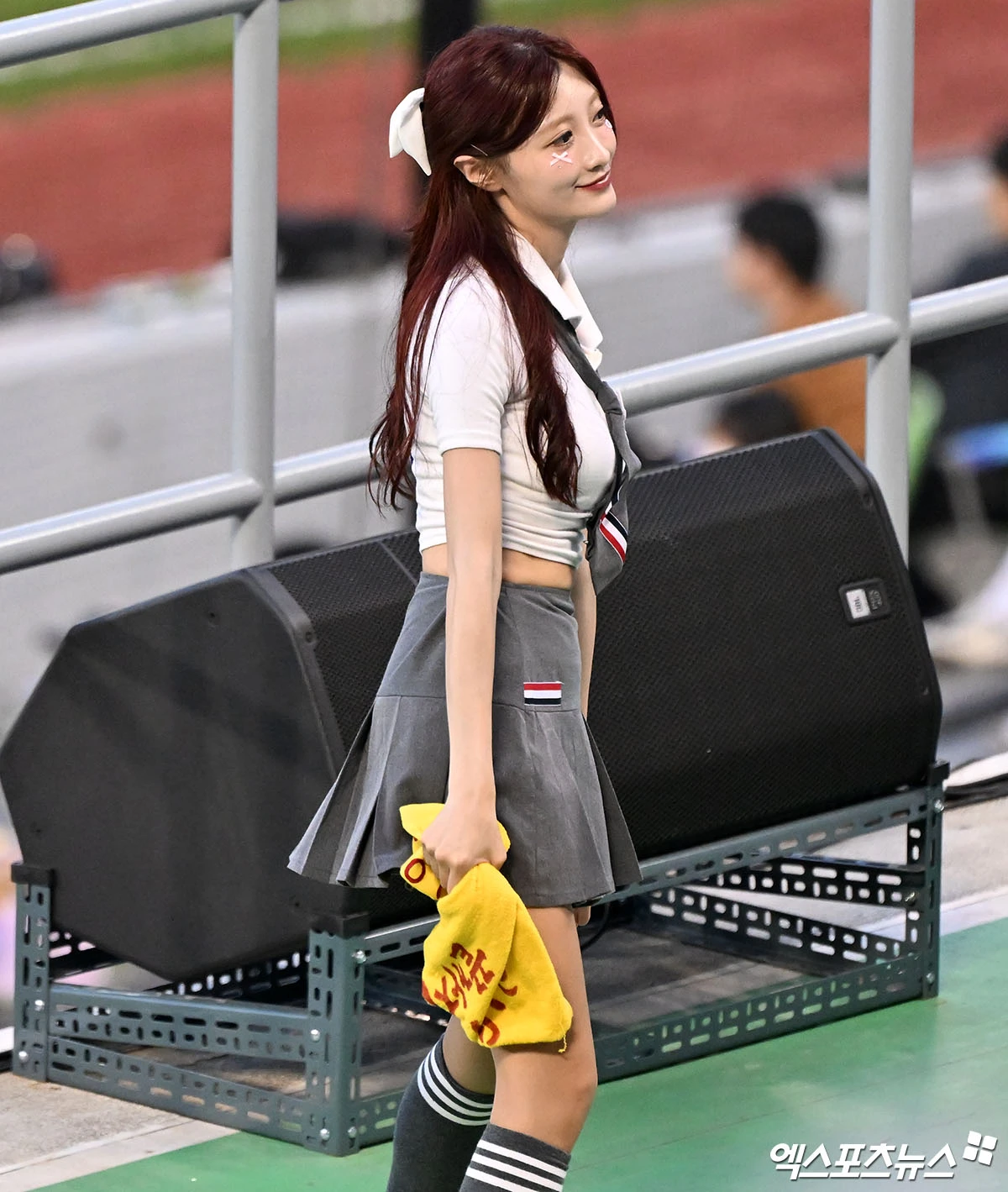 (엑스포츠뉴스 잠실, 김한준 기자) 15일 오후 서울 송파구 잠실야구장에서 열린 '2026 신한 SOL Bank KBO리그' 롯데 자이언츠와 LG 트윈스의 경기, 장로나 치어리더가 열띤 응원을 선보이고 있다.
