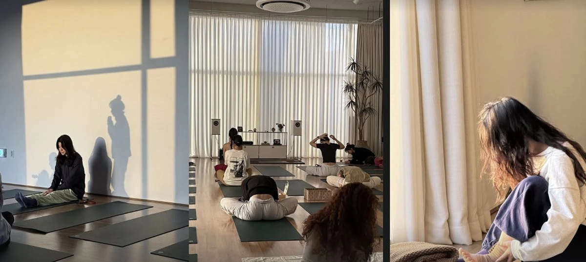 해당 사진에서는 매트 위에 앉아 몸을 풀고 있는 수강생들, 똑같은 옷을 맞춰 입고 창가에 선 사람들의 모습 등을 확인할 수 있다.