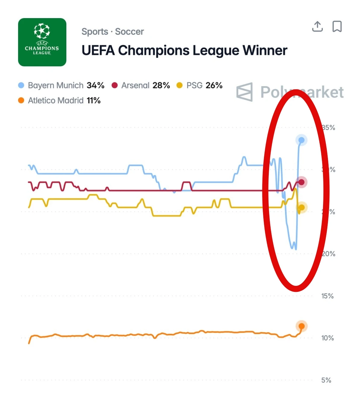 '폴리마켓'은 네 팀의 대회 우승 확률 그래프를 소개하면서 "레알 마드리드에 승리하면서 뮌헨이 챔피언스리그 우승 1순위가 됐다"라며 "이미 결승전을 본 걸까?"라고 했다.