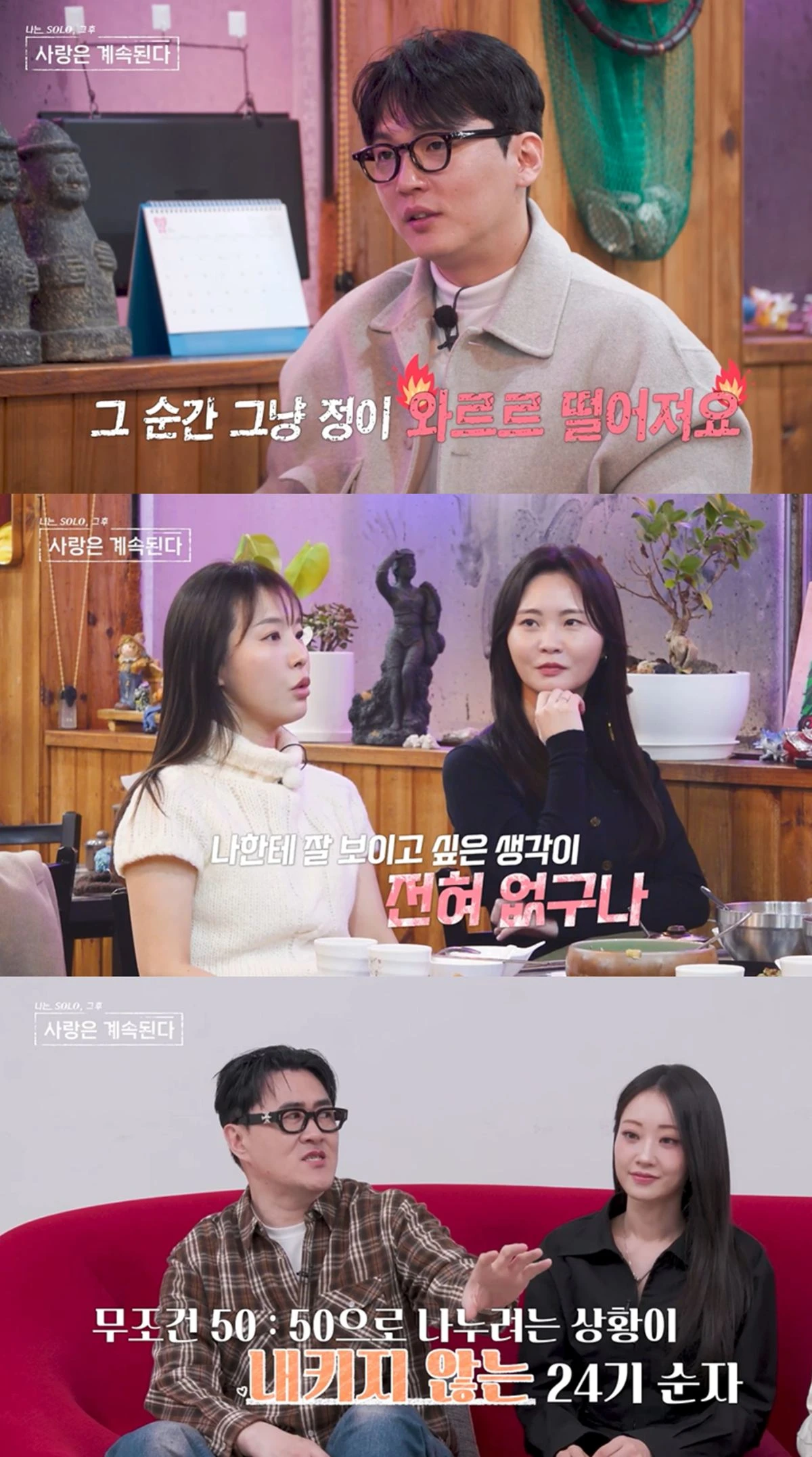 열기가 뜨거워진 가운데, 24기 순자는 "썸 타고 있는데 '네가 사' 그러면 '아, 이 사람은 나한테 잘 보이고 싶은 마음이 전혀 없구나' 하는 생각이 든다"고 털어놓는다. 그러자 18기 영호는 "왜 그렇게 흥분하냐? 불과 며칠 전 일이냐? 미안하다. 내가 다시 돈 보내줄게"라며 상확극을 시전해 무거운 분위기를 유쾌하게 띄운다.