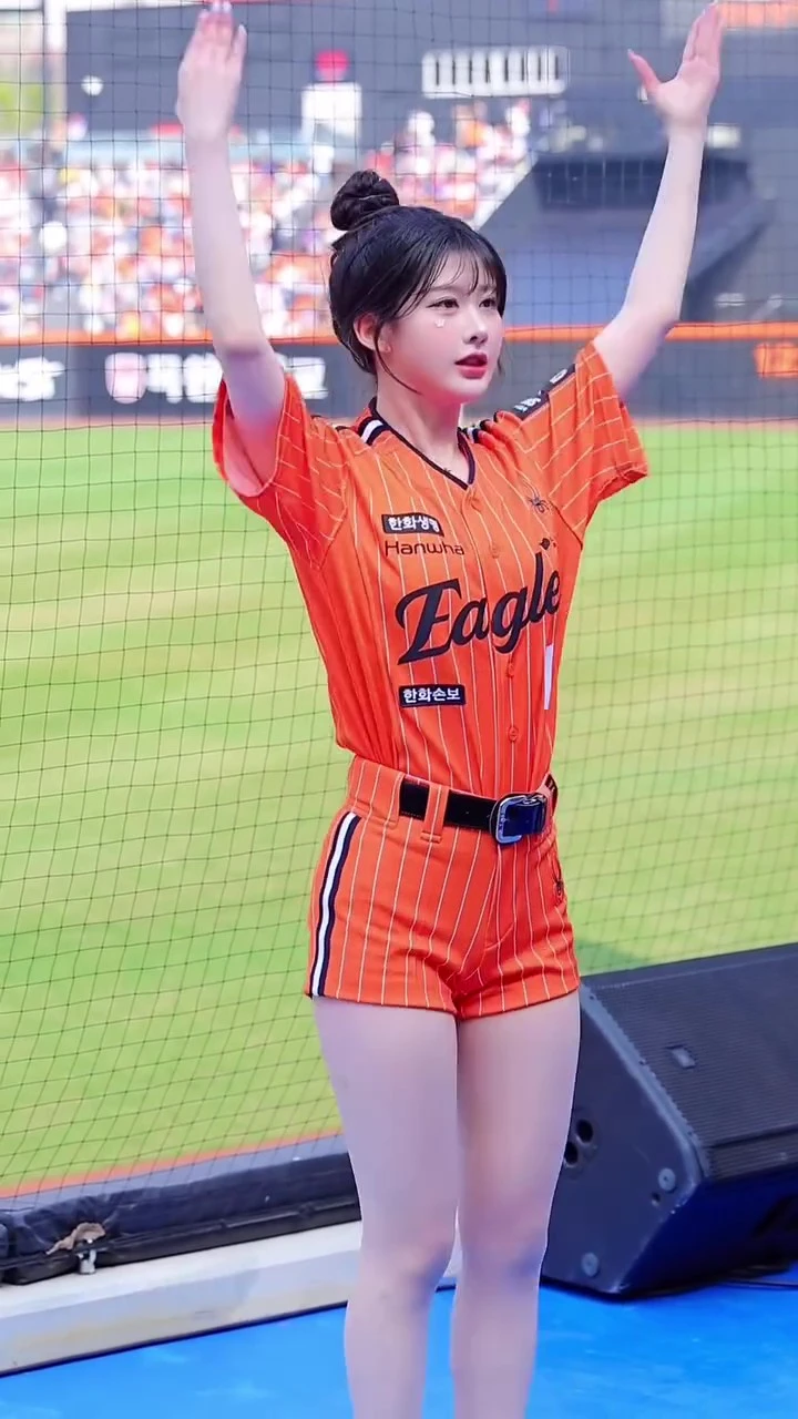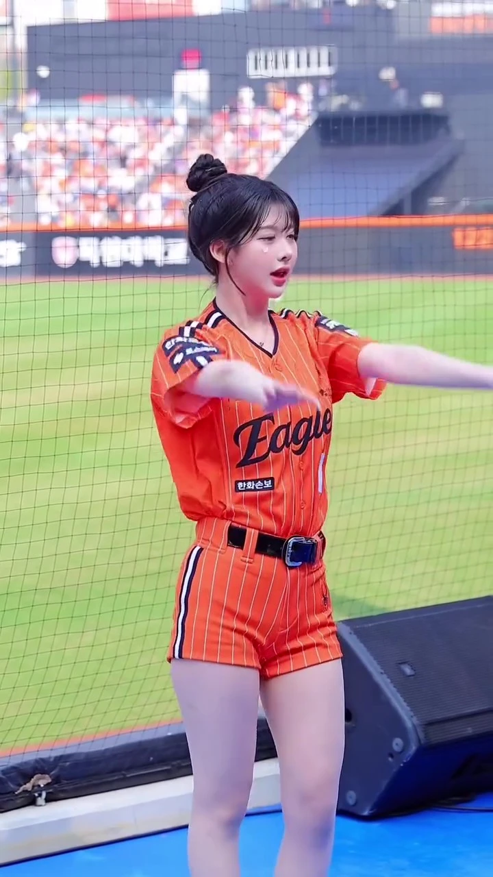 영상에서 김보미는 한화의 주황색 유니폼과 짧은 반바지를 입고 홈 팬들의 응원을 유도했다.