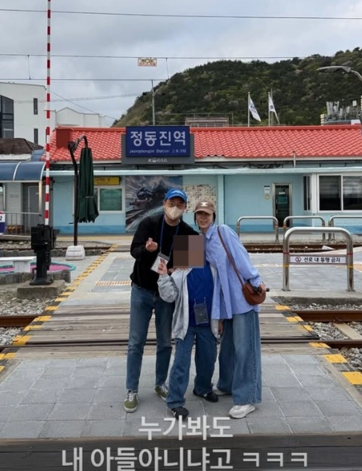 사진 속 이지혜, 문재완 부부는 정동진역 앞에서 한 소년과 다정하게 포즈를 취하고 있다. 소년은 이지혜에게 안기듯 서 있으며 앙증 맞은 포즈로 눈길을 끈다.