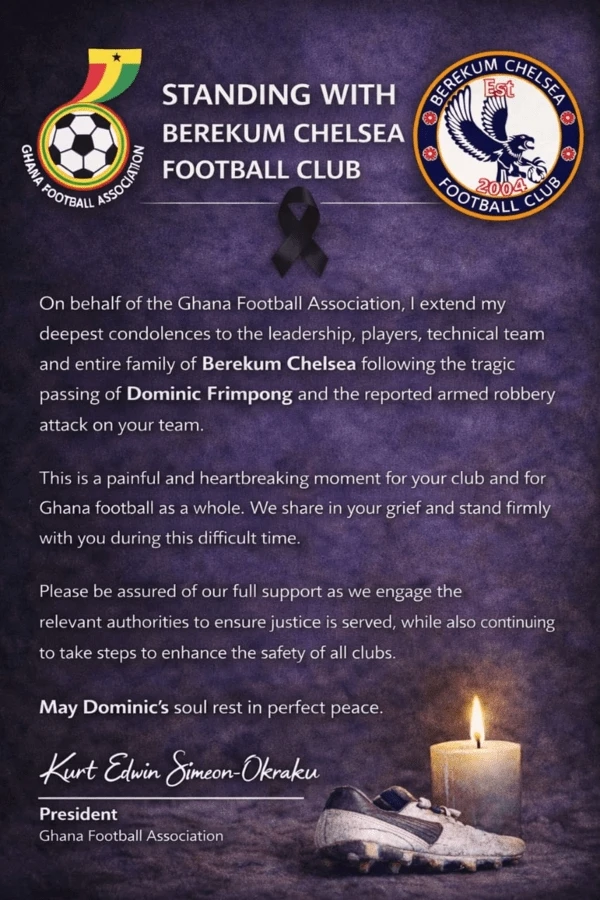 또 "우리는 고인의 유가족을 비롯해 동료 선수들과 코칭 스태프들, 구단 경영진, 그리고 베레쿰의 모든 구성원들에게 깊은 애도를 표한다"며 "이번 사건은 축구계 전반에 큰 충격을 안겼다. 이번 비극은 베레쿰만이 아니라 가나 축구계에 큰 손실이다. 프림퐁은 헌신과 열정을 바탕으로 리그의 정신을 보여준 유망한 젊은 선수였다"고 했다.