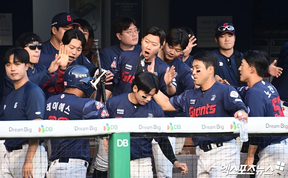 (엑스포츠뉴스 잠실, 박지영 기자) 16일 오후 서울 송파구 잠실야구장에서 열린 '2026 신한 SOL Bank KBO리그' 롯데 자이언츠와 LG 트윈스의 경기, 1회초 2사 1,3루 롯데 윤동희의 적시 2루타 때 3루주자 레이예스가 득점을 올린 뒤 더그아웃에서 동료들과 하이파이브를 나누고 있다.