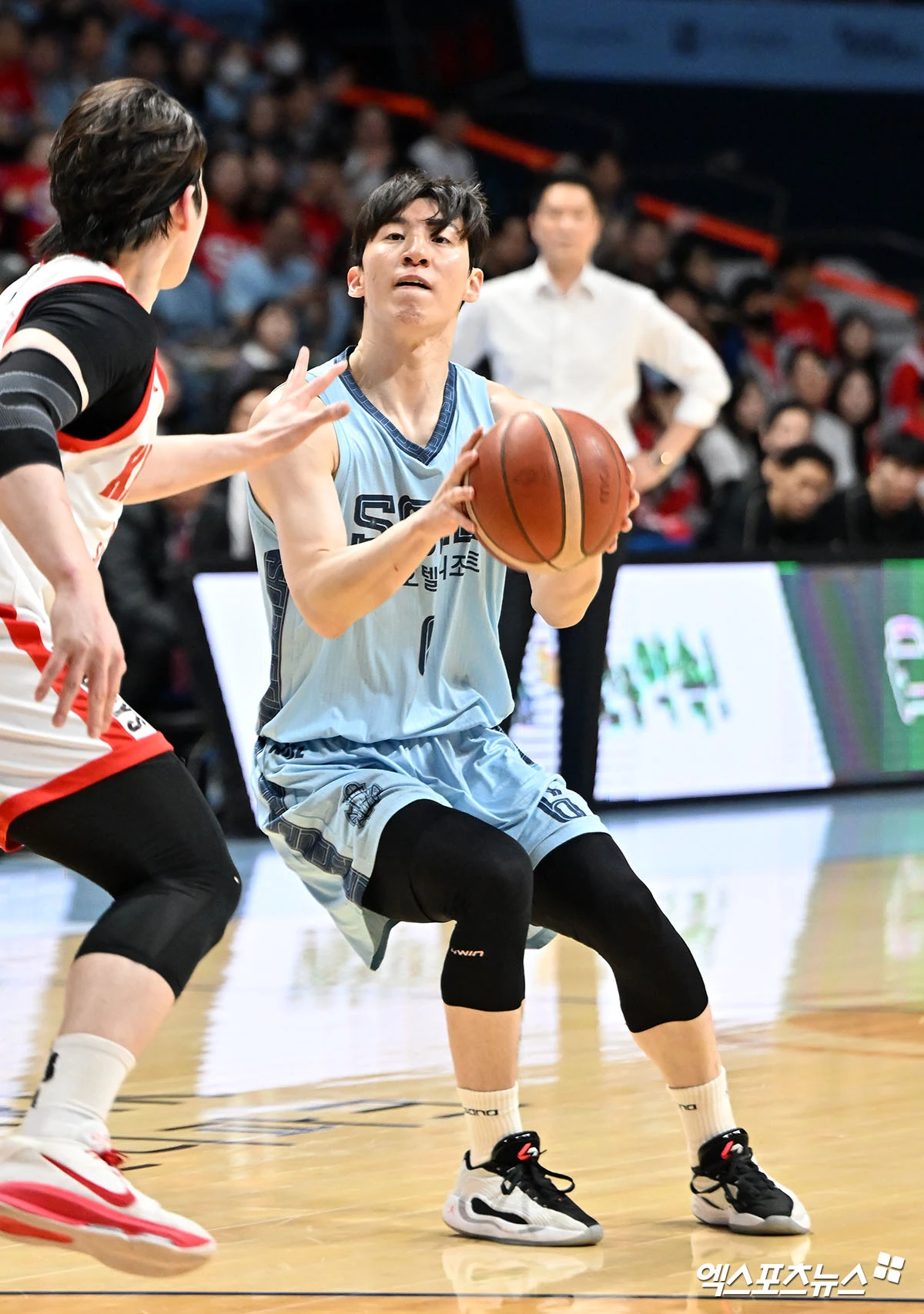 (엑스포츠뉴스 고양, 김한준 기자) 16일 오후 고양 소노아레나에서 열린 2025-2026 LG전자 프로농구 고양 소노와 서울 SK의 6강 플레이오프 3차전, 소노 이정현이 공격을 시도하고 있다.