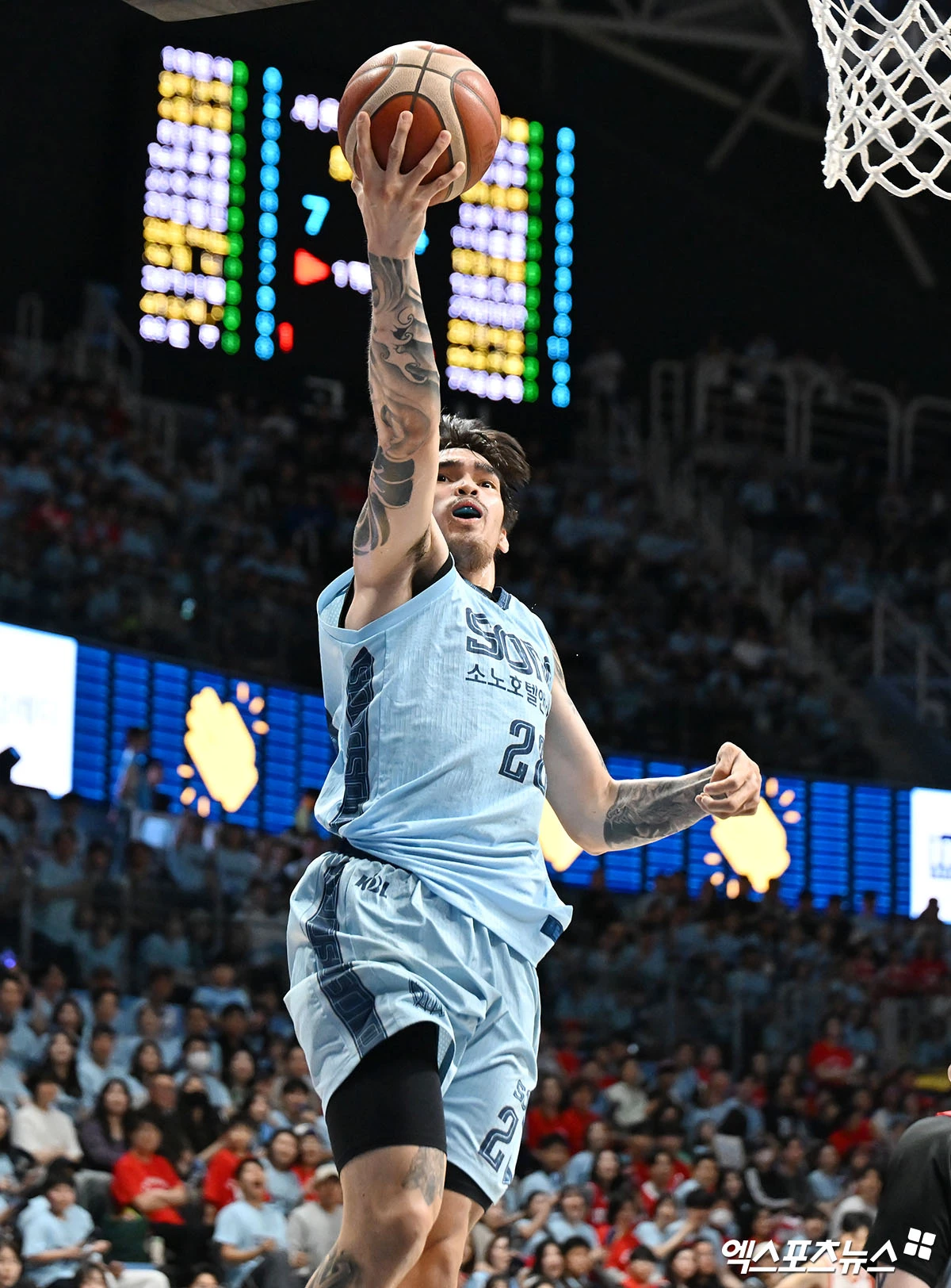 (엑스포츠뉴스 고양, 김한준 기자) 16일 오후 고양 소노아레나에서 열린 2025-2026 LG전자 프로농구 고양 소노와 서울 SK의 6강 플레이오프 3차전, 소노 켐바오가 레이업을 시도하고 있다.