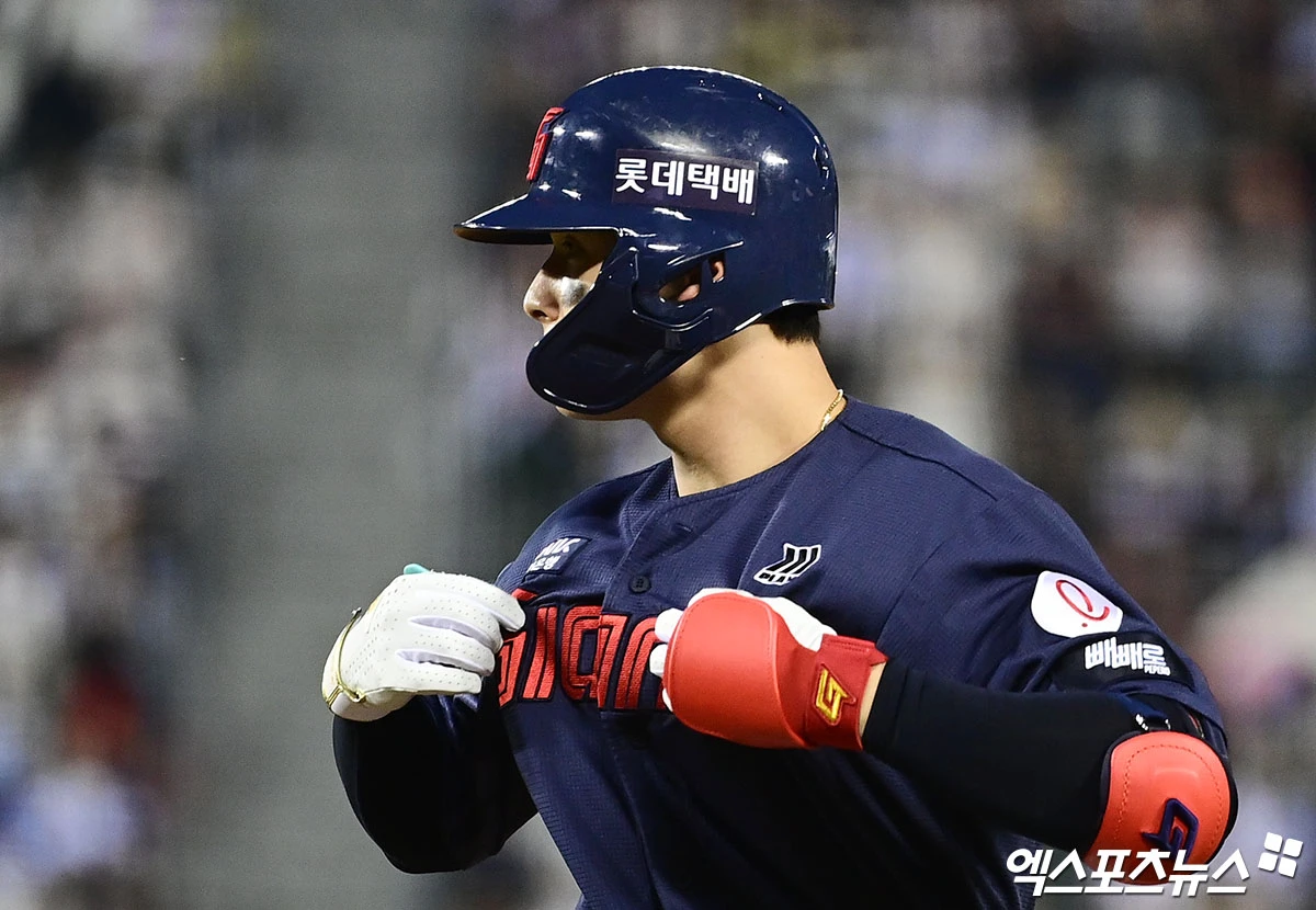 (엑스포츠뉴스 잠실, 박지영 기자) 16일 오후 서울 송파구 잠실야구장에서 열린 '2026 신한 SOL Bank KBO리그' 롯데 자이언츠와 LG 트윈스의 경기, 3회초 1사 1루 롯데 윤동희가 안타를 때려낸 뒤 세리머니를 하고 있다.