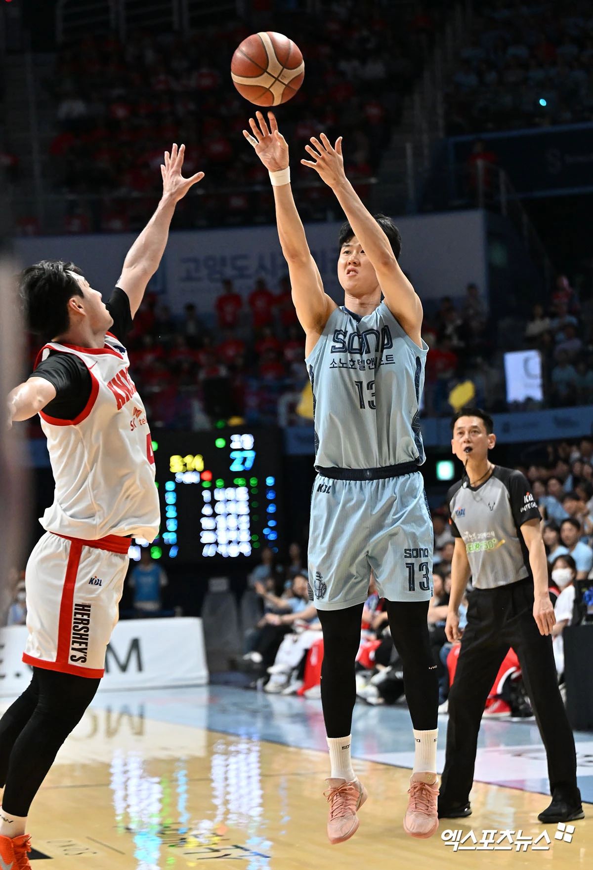 (엑스포츠뉴스 고양, 김한준 기자) 16일 오후 고양 소노아레나에서 열린 2025-2026 LG전자 프로농구 고양 소노와 서울 SK의 6강 플레이오프 3차전, 소노 임동섭이 3점슛을 시도하고 있다.