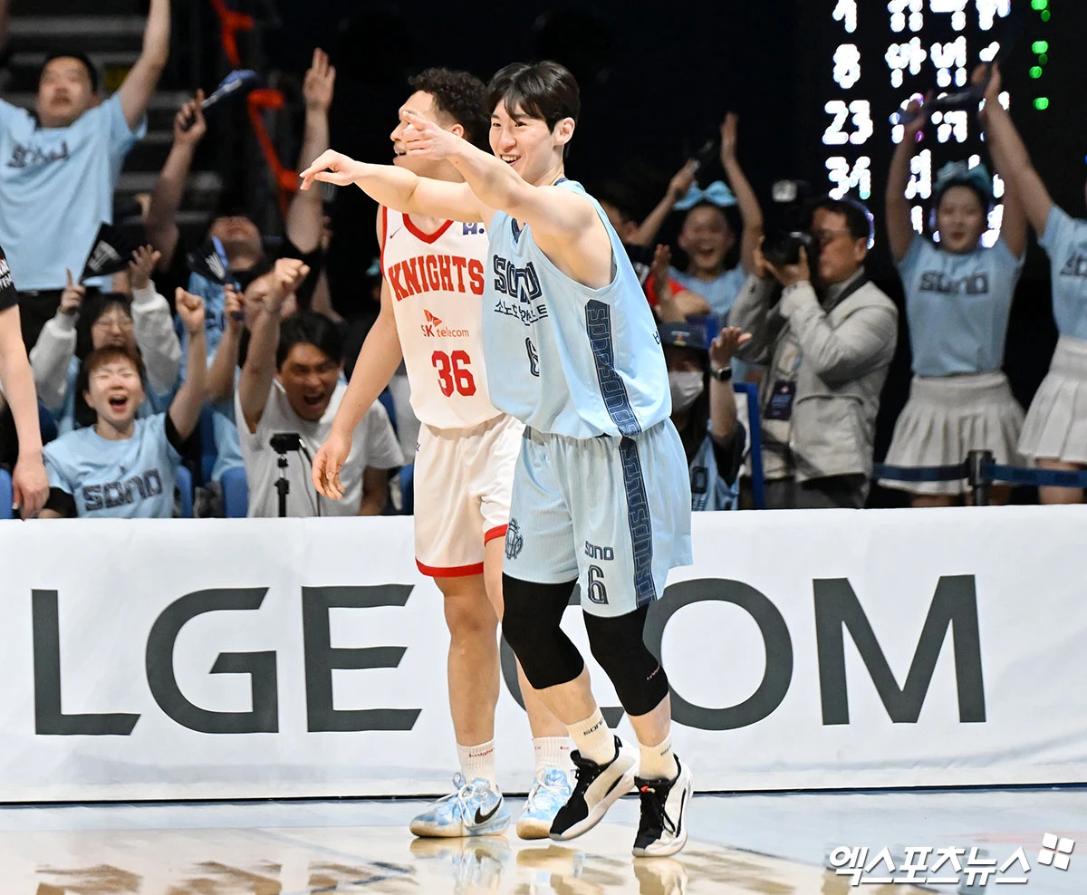 (엑스포츠뉴스 고양, 김한준 기자) 16일 오후 고양 소노아레나에서 열린 2025-2026 LG전자 프로농구 고양 소노와 서울 SK의 6강 플레이오프 3차전, 소노 이정현이 기뻐하고 있다.