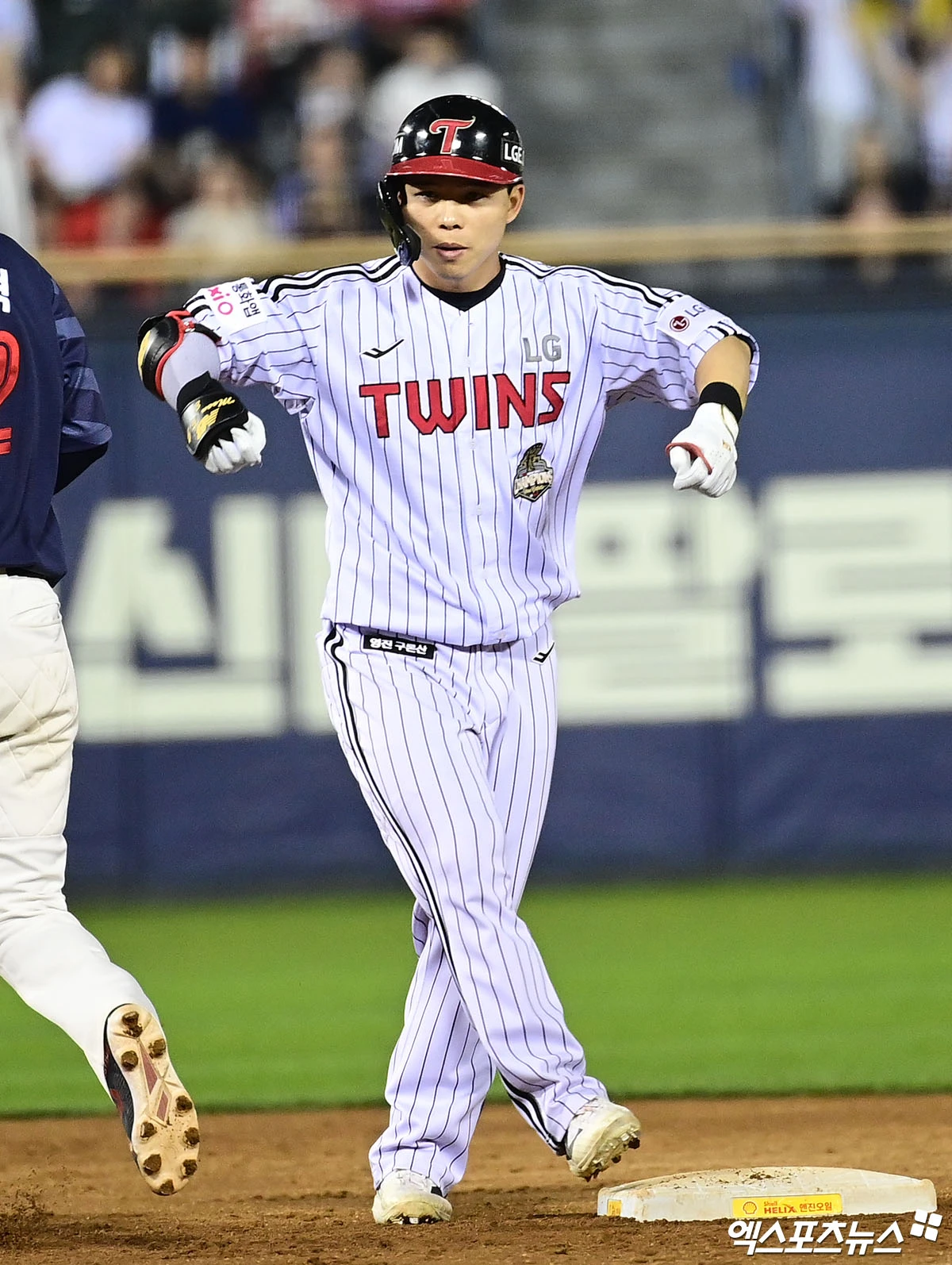 (엑스포츠뉴스 잠실, 박지영 기자) 16일 오후 서울 송파구 잠실야구장에서 열린 '2026 신한 SOL Bank KBO리그' 롯데 자이언츠와 LG 트윈스의 경기, 5회말 2사 LG 문성주가 2루타를 때려낸 뒤 세리머니를 하고 있다.