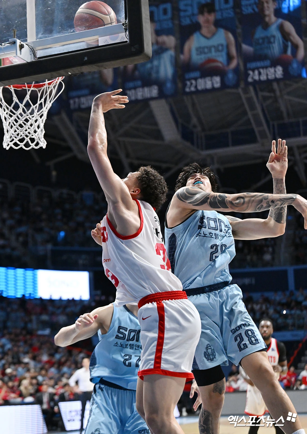 (엑스포츠뉴스 고양, 김한준 기자) 16일 오후 고양 소노아레나에서 열린 2025-2026 LG전자 프로농구 고양 소노와 서울 SK의 6강 플레이오프 3차전, 소노 켐바오가 SK 다니엘의 슛을 블락하고 있다.
