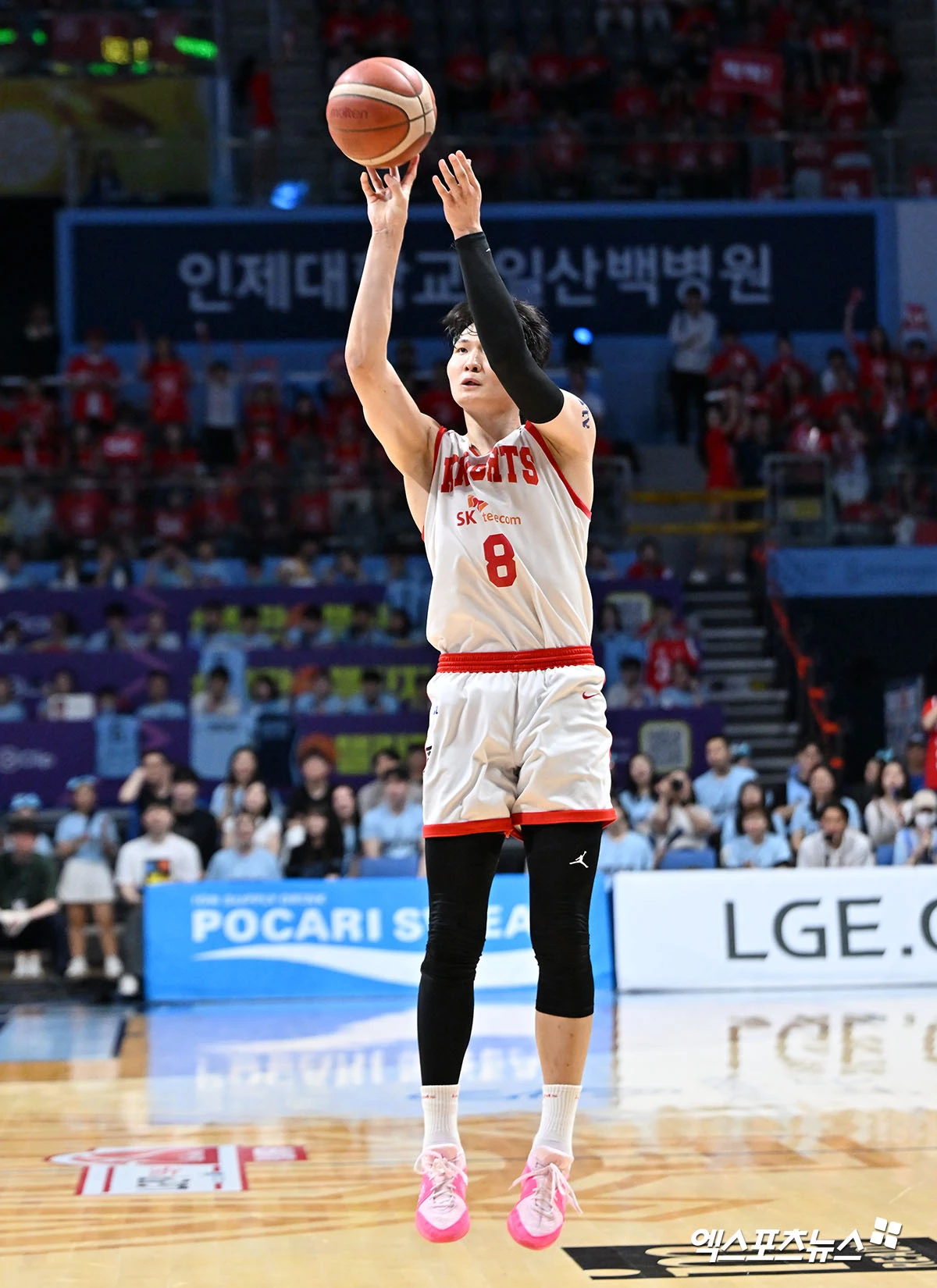 (엑스포츠뉴스 고양, 김한준 기자) 16일 오후 고양 소노아레나에서 열린 2025-2026 LG전자 프로농구 고양 소노와 서울 SK의 6강 플레이오프 3차전, SK 안영준이 3점슛을 시도하고 있다.