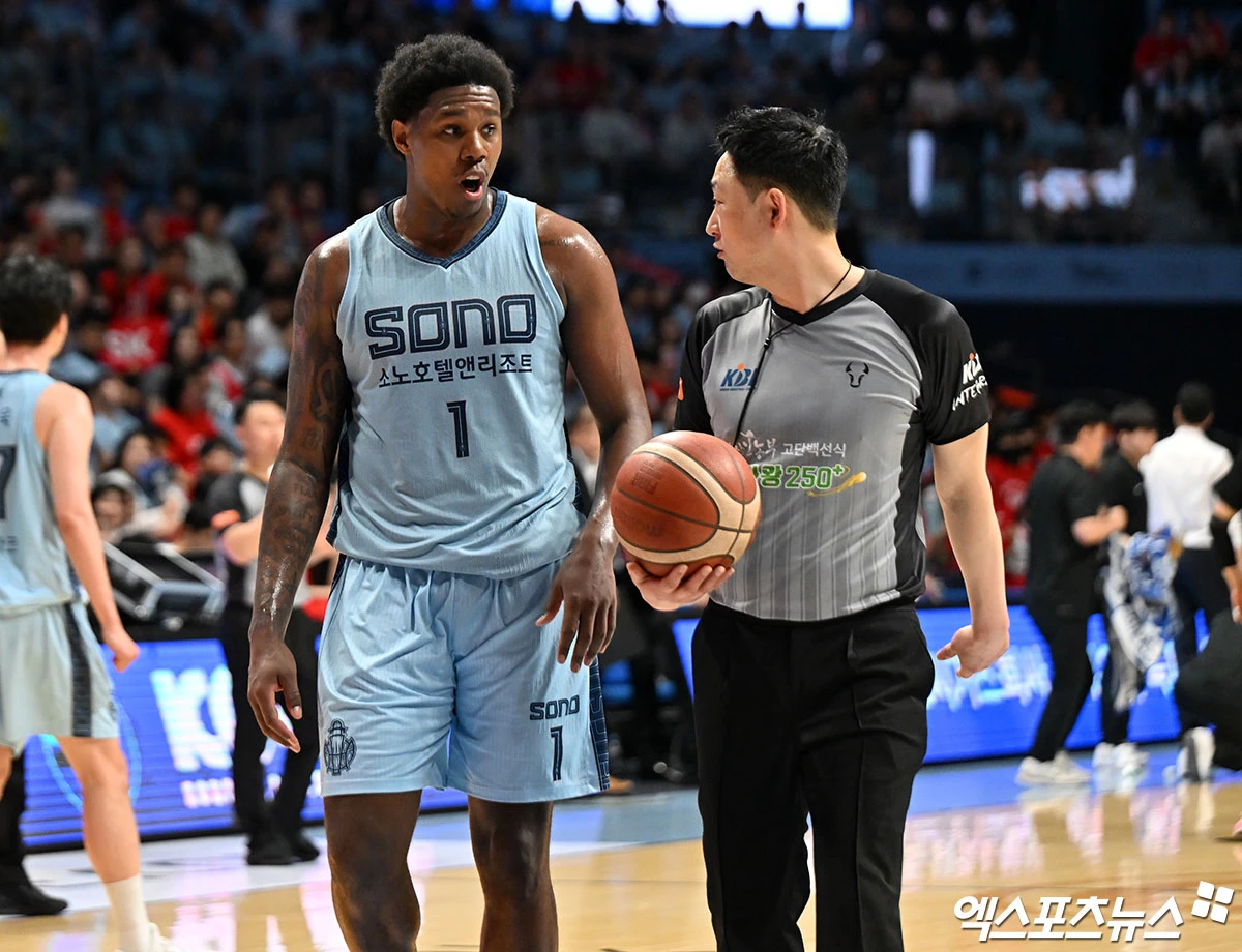 (엑스포츠뉴스 고양, 김한준 기자) 16일 오후 고양 소노아레나에서 열린 2025-2026 LG전자 프로농구 고양 소노와 서울 SK의 6강 플레이오프 3차전, 소노 나이트가 파울 선언에 대해 어필하고 있다.