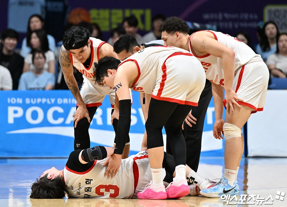 (엑스포츠뉴스 고양, 김한준 기자) 16일 오후 고양 소노아레나에서 열린 2025-2026 LG전자 프로농구 고양 소노와 서울 SK의 6강 플레이오프 3차전, SK 최원혁이 고통스러워하고 있다.