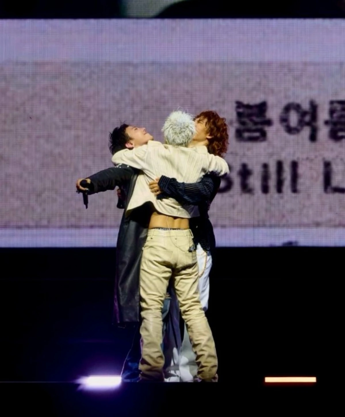 사진 속 지드래곤과 태양, 대성은 무대 위에서 서로를 끌어안고 벅찬 감정을 나누고 있다. 20년 넘는 시간을 함께한 이들의 돈독한 우애가 엿보인다.