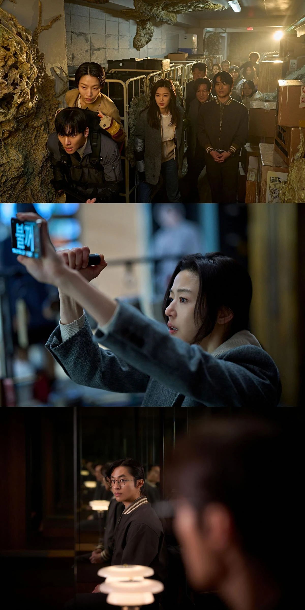 캠핑 지게에 누나 최현희(김신록)를 업고 폴대를 든 채 생존자들의 선두에 선 최현석(지창욱)의 스틸에서는 누나를 지키기 위한 그의 절박함이 느껴진다.