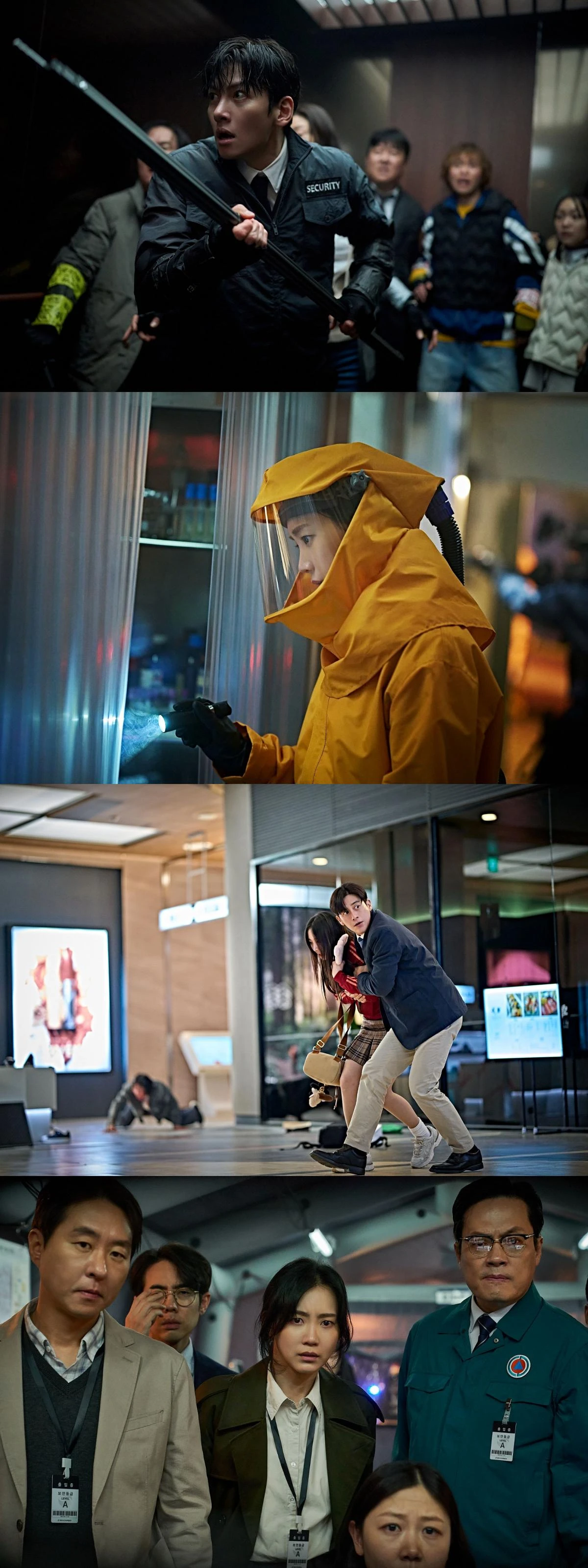 한편, 생명공학자 공설희(신현빈)는 빌딩 외부에서 상황을 지켜보며 감염 사태를 해결하기 위해 고군분투한다. 보호 장비를 착용한 채 실험실을 조사하고 있는 공설희의 모습은 사건의 실마리를 찾기 위해서라면 몸을 사리지 않고 나설 그의 활약을 기대케 한다. 휠체어에 앉아 사태를 파악 중인 최현희(김신록)의 스틸에서는 남다른 침착함으로 위기를 해결해 나갈 그의 강인한 면모를 엿볼 수 있다.