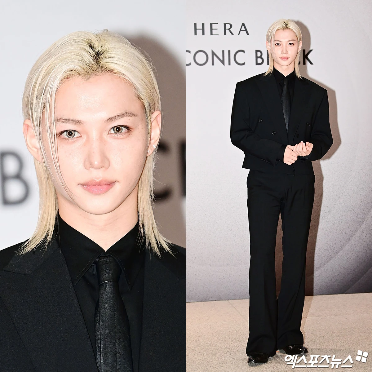특히 필릭스의 상징과도 같은 백금발 헤어가 어두운 의상과 강렬한 대비를 이루며 비현실적인 분위기를 자아냈다. 깔끔하게 뒤로 넘긴 슬릭백 헤어스타일이 날렵한 턱선과 직각 어깨 라인을 더욱 돋보이게 만들었다.