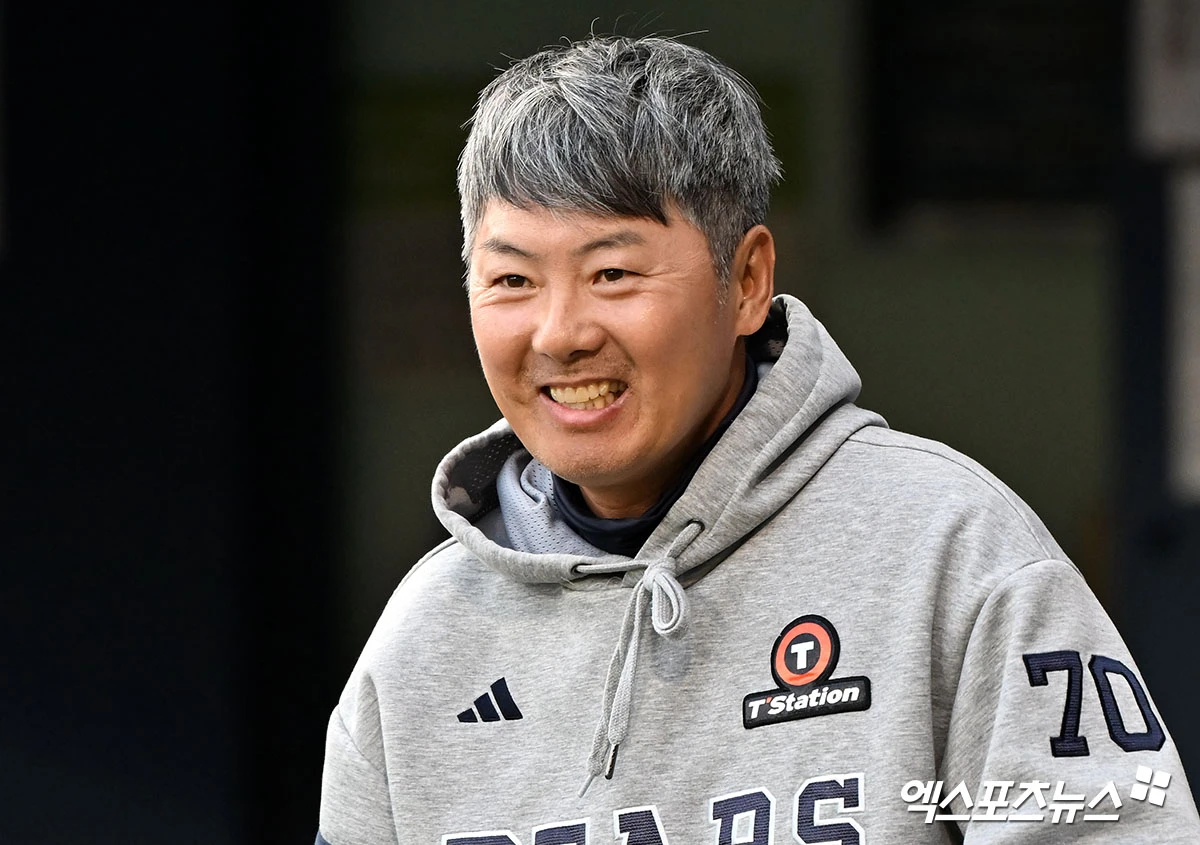 (엑스포츠뉴스 잠실, 김한준 기자) 17일 오후 서울 송파구 잠실야구장에서 열린 '2026 신한 SOL Bank KBO리그' KIA 타이거즈와 두산 베어스의 경기, 두산 김원형 감독이 미소를 보이고 있다.
