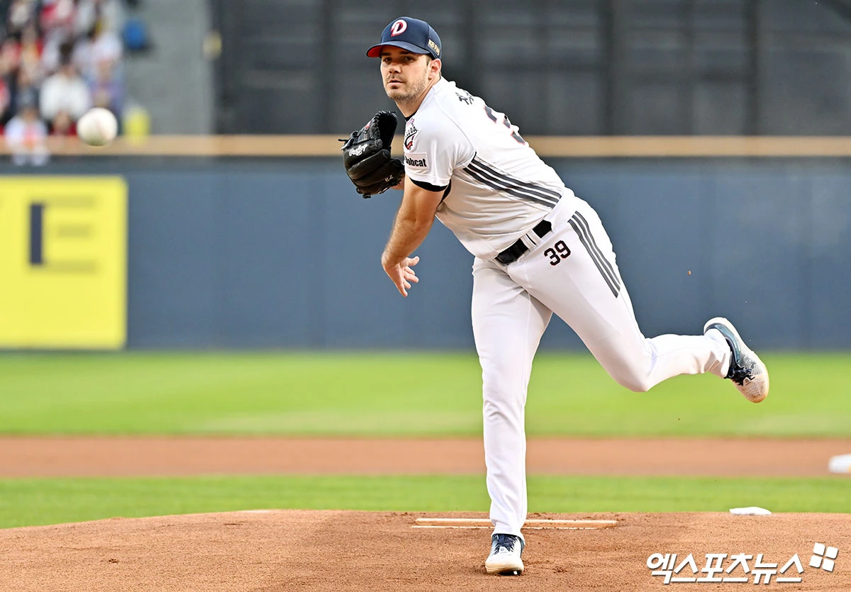 (엑스포츠뉴스 잠실, 김한준 기자) 17일 오후 서울 송파구 잠실야구장에서 열린 '2026 신한 SOL Bank KBO리그' KIA 타이거즈와 두산 베어스의 경기, 1회초 두산 선발투수 잭로그가 공을 힘차게 던지고 있다.