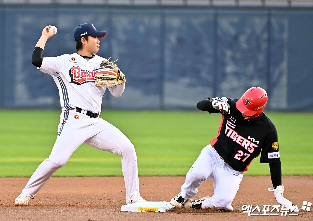 (엑스포츠뉴스 잠실, 김한준 기자) 17일 오후 서울 송파구 잠실야구장에서 열린 '2026 신한 SOL Bank KBO리그' KIA 타이거즈와 두산 베어스의 경기, 1회초 1사 1루 두산 박준순이 KIA 김선빈의 내야땅볼때 김호령을 포스아웃 시킨 후 1루로 송구하고 있다.
