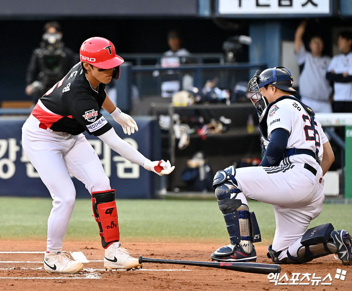 (엑스포츠뉴스 잠실, 김한준 기자) 17일 오후 서울 송파구 잠실야구장에서 열린 '2026 신한 SOL Bank KBO리그' KIA 타이거즈와 두산 베어스의 경기, 1회초 2사 1루 KIA 김도영이 볼넷으로 출루하고 있다.