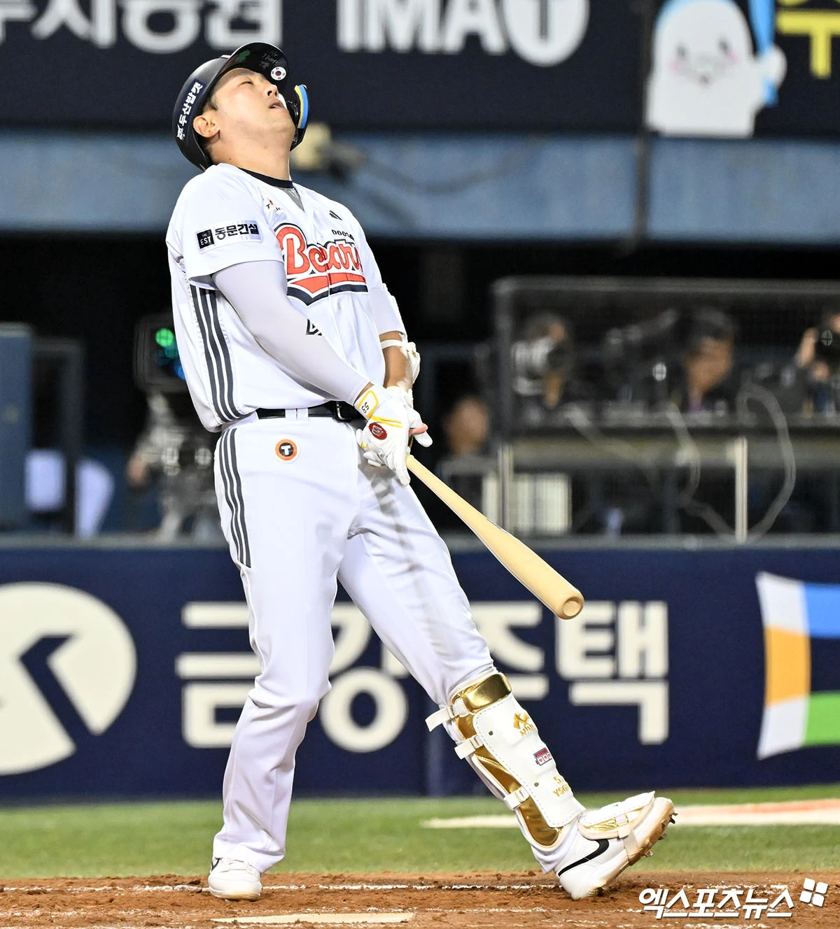 (엑스포츠뉴스 잠실, 김한준 기자) 17일 오후 서울 송파구 잠실야구장에서 열린 '2026 신한 SOL Bank KBO리그' KIA 타이거즈와 두산 베어스의 경기, 4회말 1사 1루 두산 양석환이 헛스윙 삼진을 당하고 있다.