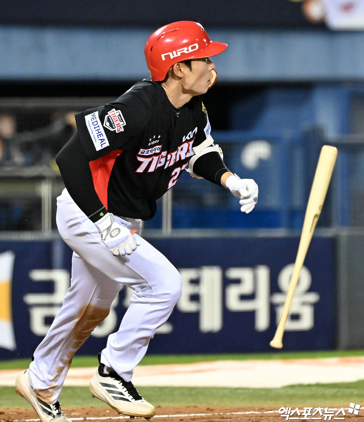 (엑스포츠뉴스 잠실, 김한준 기자) 17일 오후 서울 송파구 잠실야구장에서 열린 '2026 신한 SOL Bank KBO리그' KIA 타이거즈와 두산 베어스의 경기, 5회초 1사 KIA 김호령이 좌중간 안타를 날리고 있다.