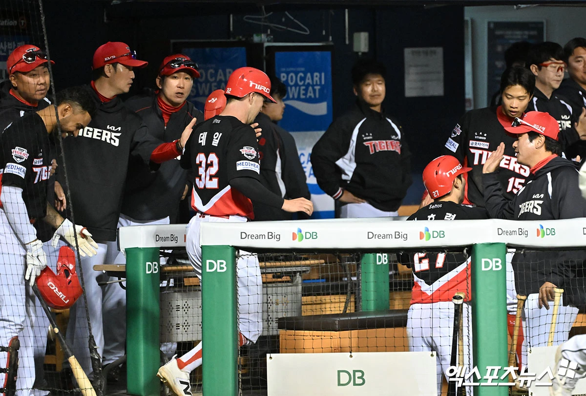 (엑스포츠뉴스 잠실, 김한준 기자) 17일 오후 서울 송파구 잠실야구장에서 열린 '2026 신한 SOL Bank KBO리그' KIA 타이거즈와 두산 베어스의 경기, 7회초 1사 1,2루 KIA 데일과 김호령이 김선빈의 2타점 2루타때 득점에 성공하고 있다.